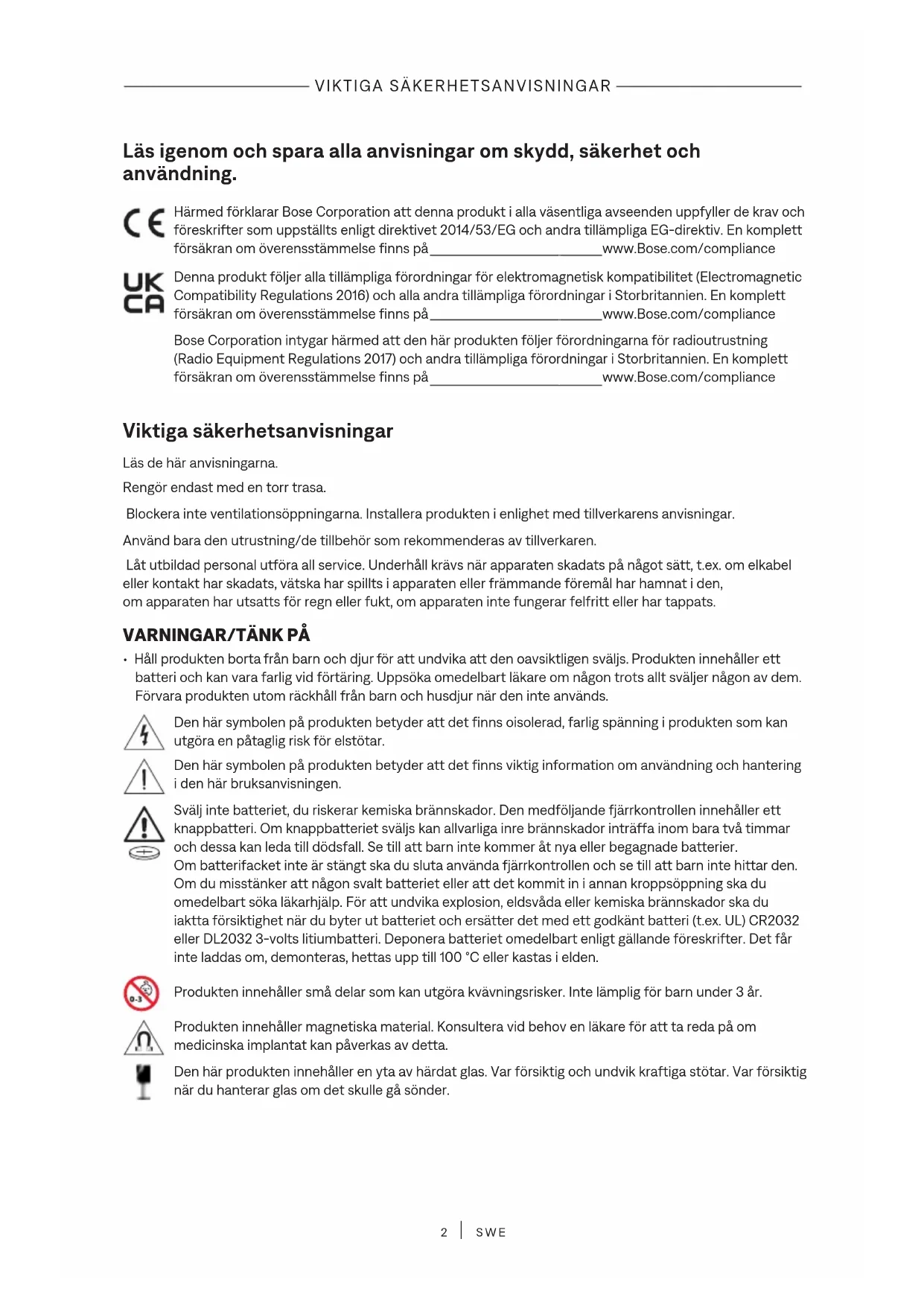 SWE Läs igenom och spara alla anvisningar om skydd, säkerhet och användning. Härmed förklarar Bose Corporation att denna produkt i alla väsentliga avseenden uppfyller de krav och föreskrifter som uppställts enligt direktivet 2014/53/EG och andra tillämpliga EG-direktiv. En komplett försäkran om överensstämmelse finns på www.Bose.com/compliancewww.Bose.com/compliance Denna produkt följer alla tillämpliga förordningar för elektromagnetisk kompatibilitet (Electromagnetic Compatibility Regulations 2016) och alla andra tillämpliga förordningar i Storbritannien. En komplett försäkran om överensstämmelse finns på www.Bose.com/compliancewww.Bose.com/compliance Bose Corporation intygar härmed att den här produkten följer förordningarna för radioutrustning (Radio Equipment Regulations 2017) och andra tillämpliga förordningar i Storbritannien. En komplett försäkran om överensstämmelse finns på www.Bose.com/compliancewww.Bose.com/compliance Viktiga säkerhetsanvisningar Läs de här anvisningarna. Rengör endast med en torr trasa. Blockera inte ventilationsöppningarna. Installera produkten i enlighet med tillverkarens anvisningar. Använd bara den utrustning/de tillbehör som rekommenderas av tillverkaren. Låt utbildad personal utföra all service. Underhåll krävs när apparaten skadats på något sätt, t.ex. om elkabel eller kontakt har skadats, vätska har spillts i apparaten eller främmande föremål har hamnat i den, om apparaten har utsatts för regn eller fukt, om apparaten inte fungerar felfritt eller har tappats.