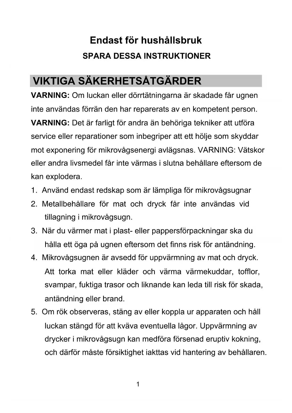 VARNING: Om luckan eller dörrtätningarna är skadade får ugnen inte användas förrän den har reparerats av en kompetent person. VARNING: Det är farligt för andra än behöriga tekniker att utföra service eller reparationer som inbegriper att ett hölje som skyddar mot exponering för mikrovågsenergi avlägsnas. VARNING: Vätskor eller andra livsmedel får inte värmas i slutna behållare eftersom de kan explodera.