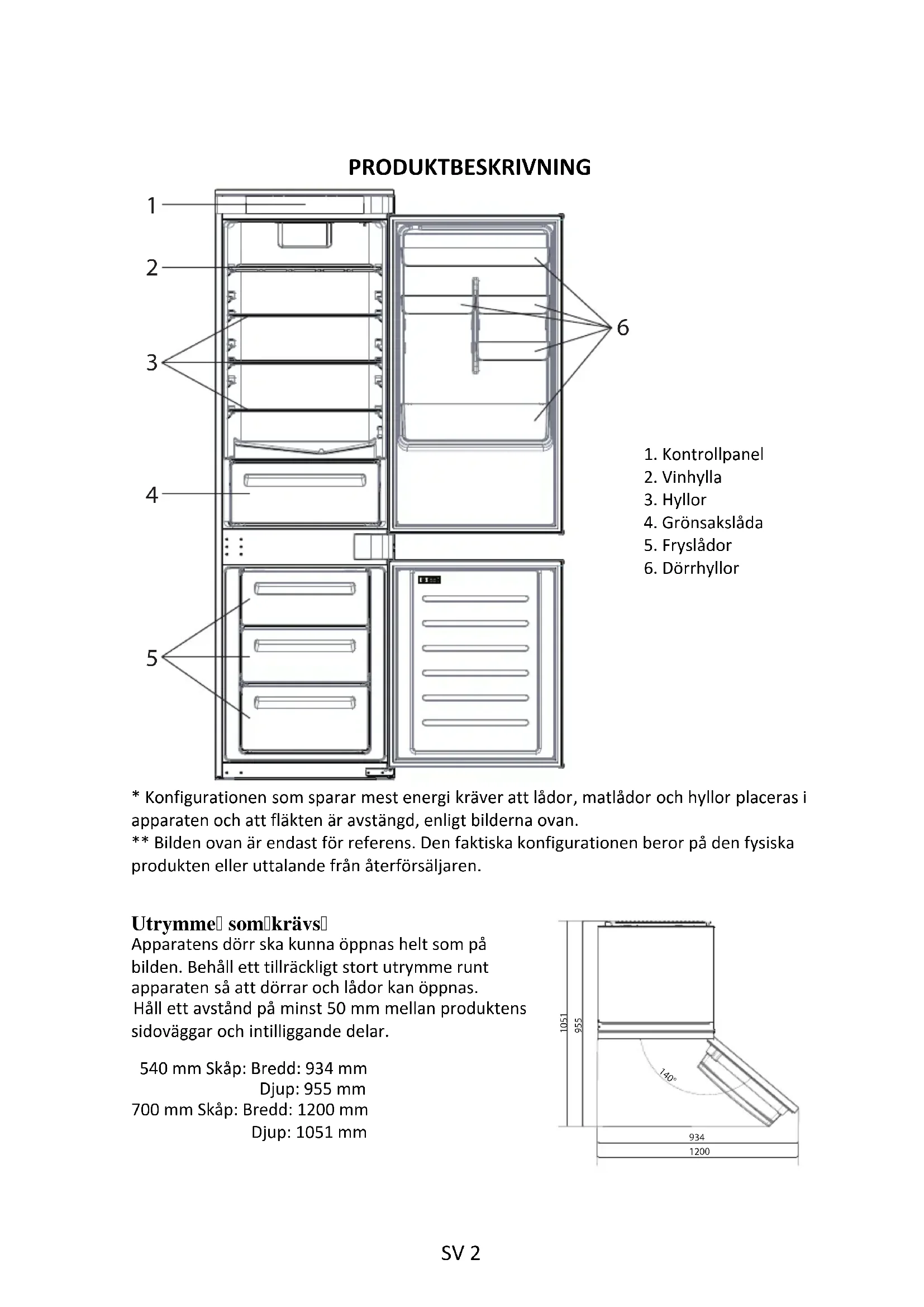 - Konfigurationen som sparar mest energi kräver att lådor, matlådor och hyllor placeras i apparaten och att fläkten är avstängd, enligt bilderna ovan. ** Bilden ovan är endast för referens. Den faktiska konfigurationen beror på den fysiska produkten eller uttalande från återförsäljaren. Utrymme somkrävs Apparatens dörr ska kunna öppnas helt som på bilden. Behåll ett tillräckligt stort utrymme runt apparaten så att dörrar och lådor kan öppnas. Håll ett avstånd på minst 50 mm mellan produktens sidoväggar och intilliggande delar. 540 mm Skåp: Bredd: 934 mm Djup: 955 mm 700 mm Skåp: Bredd: 1200 mm Djup: 1051 mm