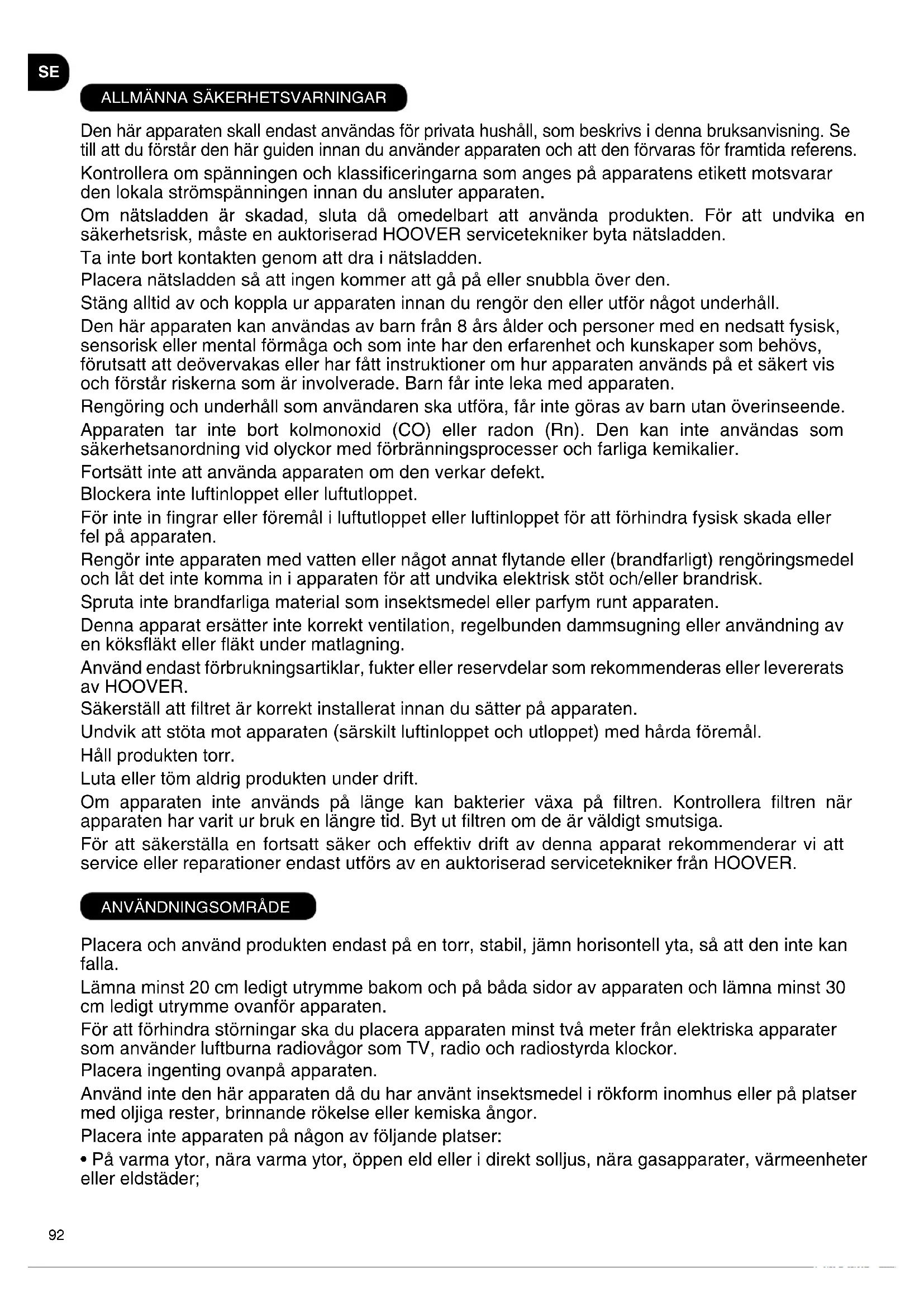 Den här apparaten skall endast användas för privata hushåll, som beskrivs i denna bruksanvisning. Se till att du förstår den här guiden innan du använder apparaten och att den förvaras för framtida referens. Kontrollera om spänningen och klassiceringarna som anges på apparatens etikett motsvarar den lokala strömspänningen innan du ansluter apparaten. Om nätsladden är skadad, sluta då omedelbart att använda produkten. För att undvika en säkerhetsrisk, måste en auktoriserad HOOVER servicetekniker byta nätsladden. Ta inte bort kontakten genom att dra i nätsladden. Placera nätsladden så att ingen kommer att gå på eller snubbla över den. Stäng alltid av och koppla ur apparaten innan du rengör den eller utför något underhåll. Den här apparaten kan användas av barn från 8 års ålder och personer med en nedsatt fysisk, sensorisk eller mental förmåga och som inte har den erfarenhet och kunskaper som behövs, förutsatt att deövervakas eller har fått instruktioner om hur apparaten används på et säkert vis och förstår riskerna som är involverade. Barn får inte leka med apparaten. Rengöring och underhåll som användaren ska utföra, får inte göras av barn utan överinseende. Apparaten tar inte bort kolmonoxid (CO) eller radon (Rn). Den kan inte användas som säkerhetsanordning vid olyckor med förbränningsprocesser och farliga kemikalier. Fortsätt inte att använda apparaten om den verkar defekt. Blockera inte luftinloppet eller luftutloppet. För inte in ngrar eller föremål i luftutloppet eller luftinloppet för att förhindra fysisk skada eller fel på apparaten. Rengör inte apparaten med vatten eller något annat ytande eller (brandfarligt) rengöringsmedel och låt det inte komma in i apparaten för att undvika elektrisk stöt och/eller brandrisk. Spruta inte brandfarliga material som insektsmedel eller parfym runt apparaten. Denna apparat ersätter inte korrekt ventilation, regelbunden dammsugning eller användning av en köksäkt eller äkt under matlagning. Använd endast förbrukningsartiklar, fukter eller reservdelar som rekommenderas eller levererats av HOOVER. Säkerställ att ltret är korrekt installerat innan du sätter på apparaten. Undvik att stöta mot apparaten (särskilt luftinloppet och utloppet) med hårda föremål. Håll produkten torr. Luta eller töm aldrig produkten under drift. Om apparaten inte används på länge kan bakterier växa på ltren. Kontrollera ltren när apparaten har varit ur bruk en längre tid. Byt ut ltren om de är väldigt smutsiga. För att säkerställa en fortsatt säker och effektiv drift av denna apparat rekommenderar vi att service eller reparationer endast utförs av en auktoriserad servicetekniker från HOOVER.
