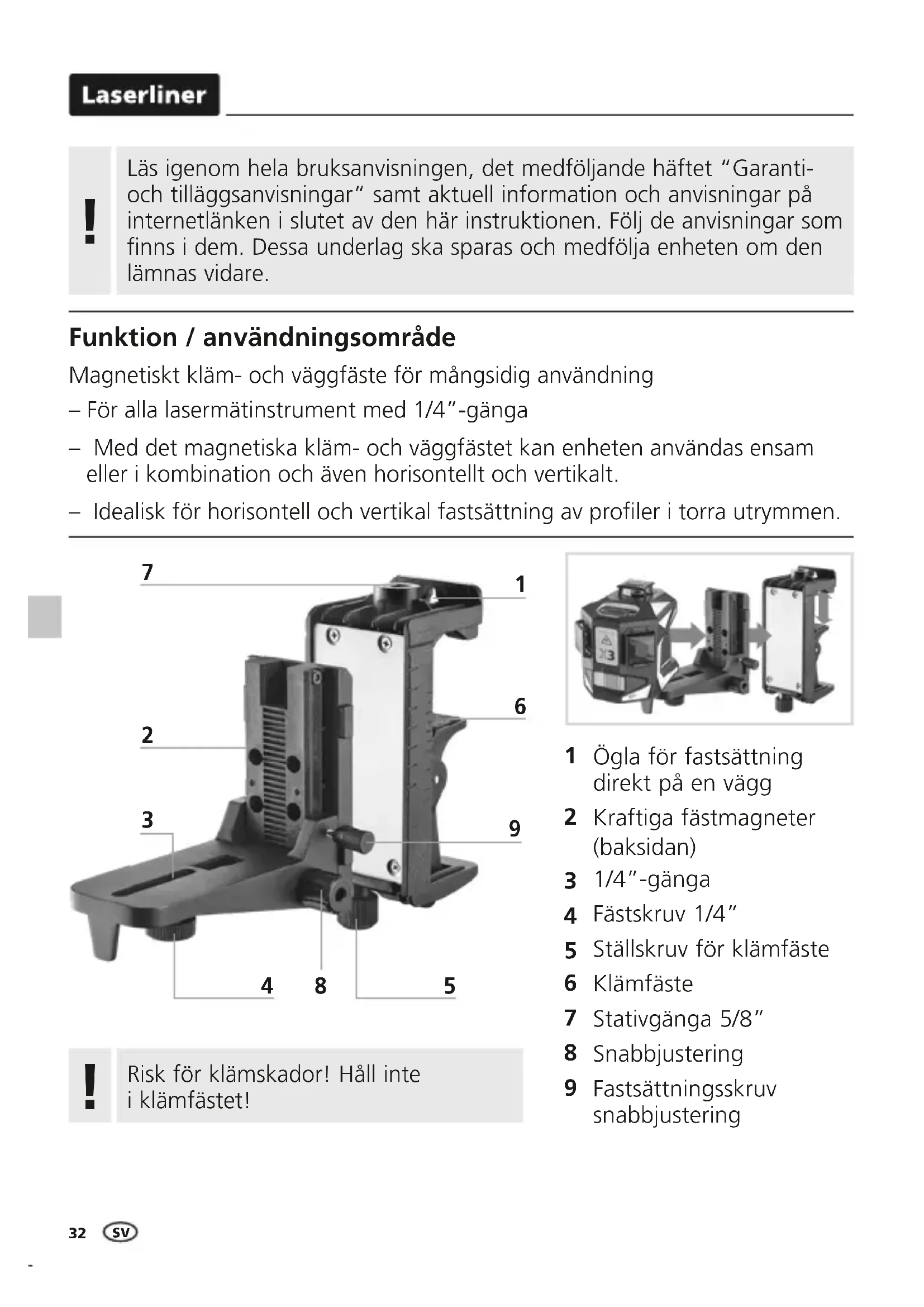 Funktion / användningsområde Magnetiskt kläm- och väggfäste för mångsidig användning – För alla lasermätinstrument med 1/4”-gänga – Med det magnetiska kläm- och väggfästet kan enheten användas ensam eller i kombination och även horisontellt och vertikalt. – Idealisk för horisontell och vertikal fastsättning av proler i torra utrymmen. Läs igenom hela bruksanvisningen, det medföljande häftet “Garanti- och tilläggsanvisningar“ samt aktuell information och anvisningar på internetlänken i slutet av den här instruktionen. Följ de anvisningar som finns i dem. Dessa underlag ska sparas och medfölja enheten om den lämnas vidare.