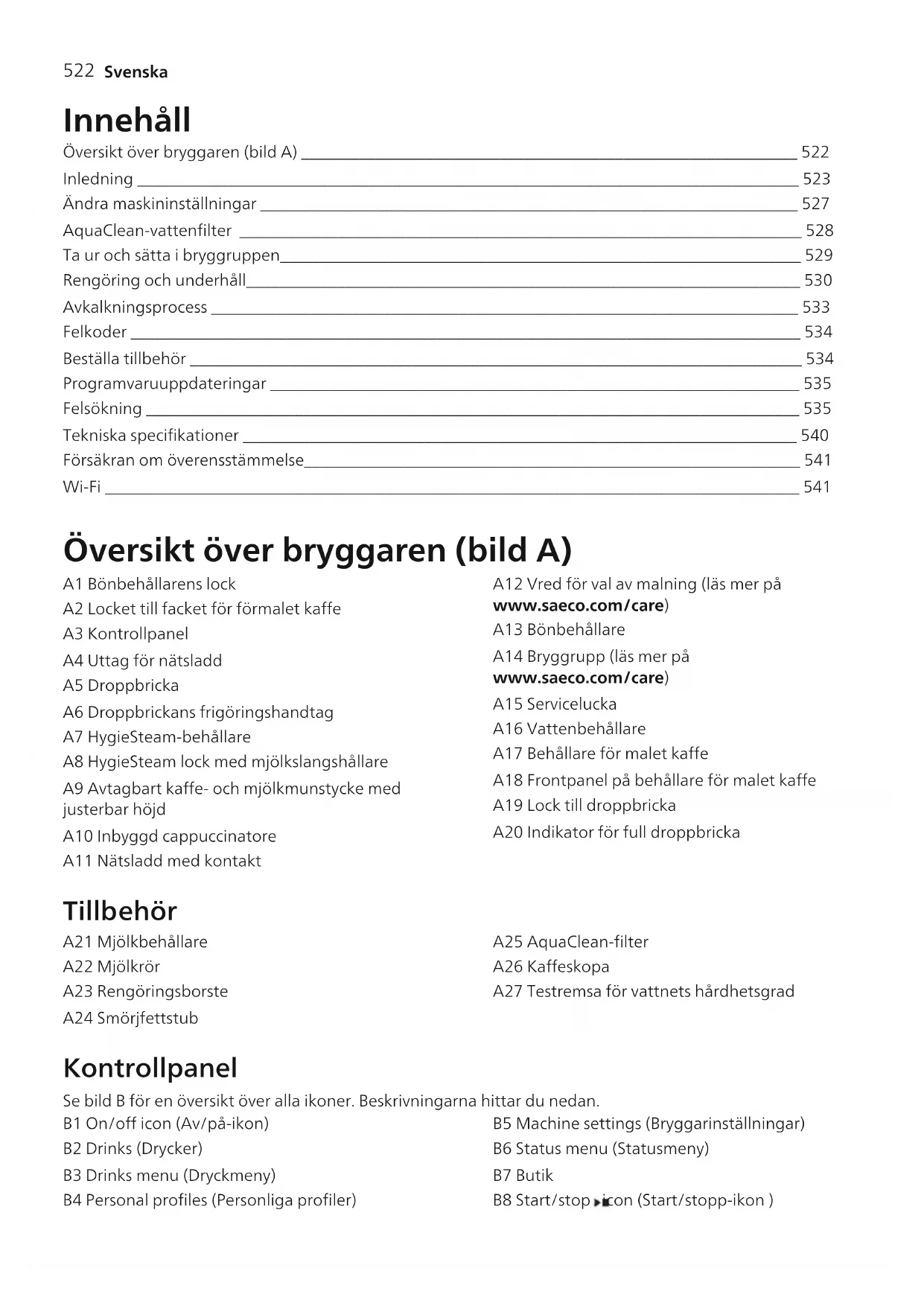 Svenska Innehåll Översikt över bryggaren (bild A) ____________________________________________________________ 522 Inledning ________________________________________________________________________________ 523 Ändra maskininställningar _________________________________________________________________ 527 AquaClean-vattenfilter ____________________________________________________________________ 528 Ta ur och sätta i bryggruppen_______________________________________________________________ 529 Rengöring och underhåll___________________________________________________________________ 530 Avkalkningsprocess _______________________________________________________________________ 533 Felkoder _________________________________________________________________________________ 534 Beställa tillbehör __________________________________________________________________________ 534 Programvaruuppdateringar ________________________________________________________________ 535 Felsökning _______________________________________________________________________________ 535 Tekniska specifikationer ___________________________________________________________________ 540 Försäkran om överensstämmelse____________________________________________________________ 541 Wi-Fi ____________________________________________________________________________________ 541 Översikt över bryggaren (bild A) A1 Bönbehållarens lock A2 Locket till facket för förmalet kaffe A3 Kontrollpanel A4 Uttag för nätsladd A5 Droppbricka A6 Droppbrickans frigöringshandtag A7 HygieSteam-behållare A8 HygieSteam lock med mjölkslangshållare A9 Avtagbart kaffe- och mjölkmunstycke med justerbar höjd A10 Inbyggd cappuccinatore A11 Nätsladd med kontakt A12 Vred för val av malning (läs mer på www.saeco.com/care) A13 Bönbehållare A14 Bryggrupp (läs mer på www.saeco.com/care) A15 Servicelucka A16 Vattenbehållare A17 Behållare för malet kaffe A18 Frontpanel på behållare för malet kaffe A19 Lock till droppbricka A20 Indikator för full droppbricka Tillbehör A21 Mjölkbehållare A22 Mjölkrör A23 Rengöringsborste A24 Smörjfettstub A25 AquaClean-filter A26 Kaffeskopa A27 Testremsa för vattnets hårdhetsgrad Kontrollpanel Se bild B för en översikt över alla ikoner. Beskrivningarna hittar du nedan. B1 On/off icon (Av/på-ikon) B2 Drinks (Drycker) B3 Drinks menu (Dryckmeny) B4 Personal profiles (Personliga profiler) B5 Machine settings (Bryggarinställningar) B6 Status menu (Statusmeny) B7 Butik B8 Start/stop icon (Start/stopp-ikon )523 Svenska Inledning Grattis till ditt köp av en helautomatisk Saeco-kaffemaskin! Om du vill dra nytta av onlinesupporten från Saeco kan du använda kontrollpanelen för att registrera maskinen via den inbyggda Wi-Fi-anslutningen eller besöka www.saeco.com/MyCoffeeMachine och registrera produkten där. Läs noggrant det separata häftet med säkerhetsinformation innan du använder bryggaren för första gången och spara det för framtida bruk. Den helautomatiska Saeco-kaffemaskinen har en Wi-Fi-funktion som förbättrar din kaffeupplevelse. Genom att ansluta kaffemaskinen till ditt Wi-Fi-nätverk kan du: