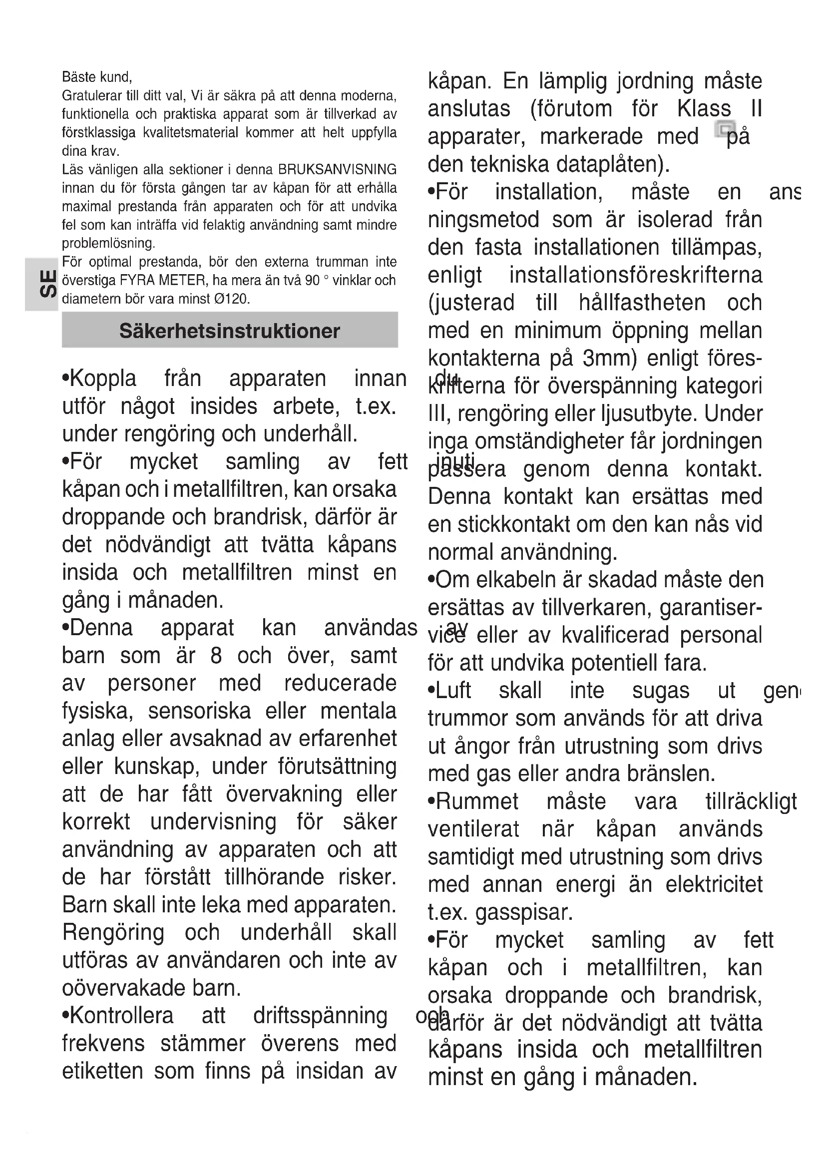 - För mycket samling av fett inuti kåpan och i metallfiltren, kan orsaka droppande och brandrisk, därför är det nödvändigt att tvätta kåpans insida och metallfiltren minst en gång i månaden. Säkerhetsinstruktioner SESE