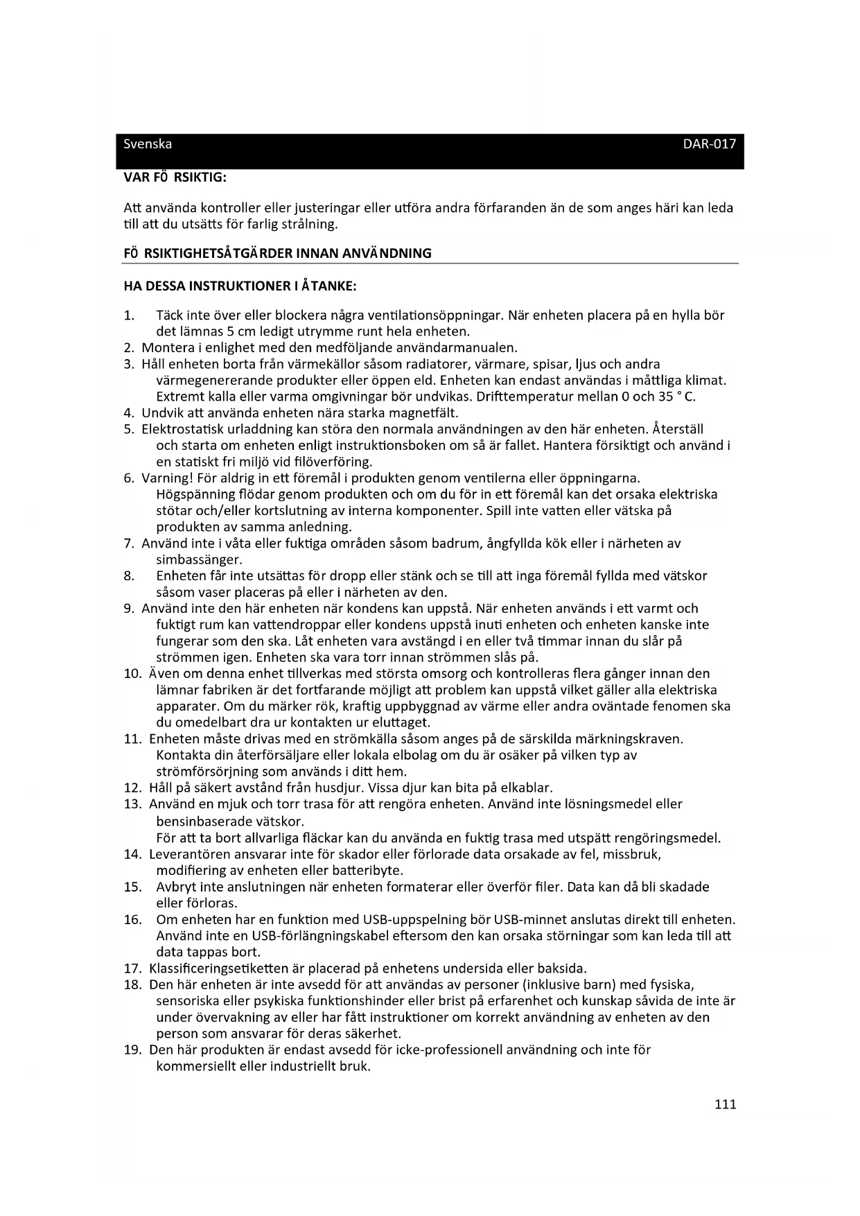 19. Den här produkten är endast avsedd för icke-professionell användning och inte för