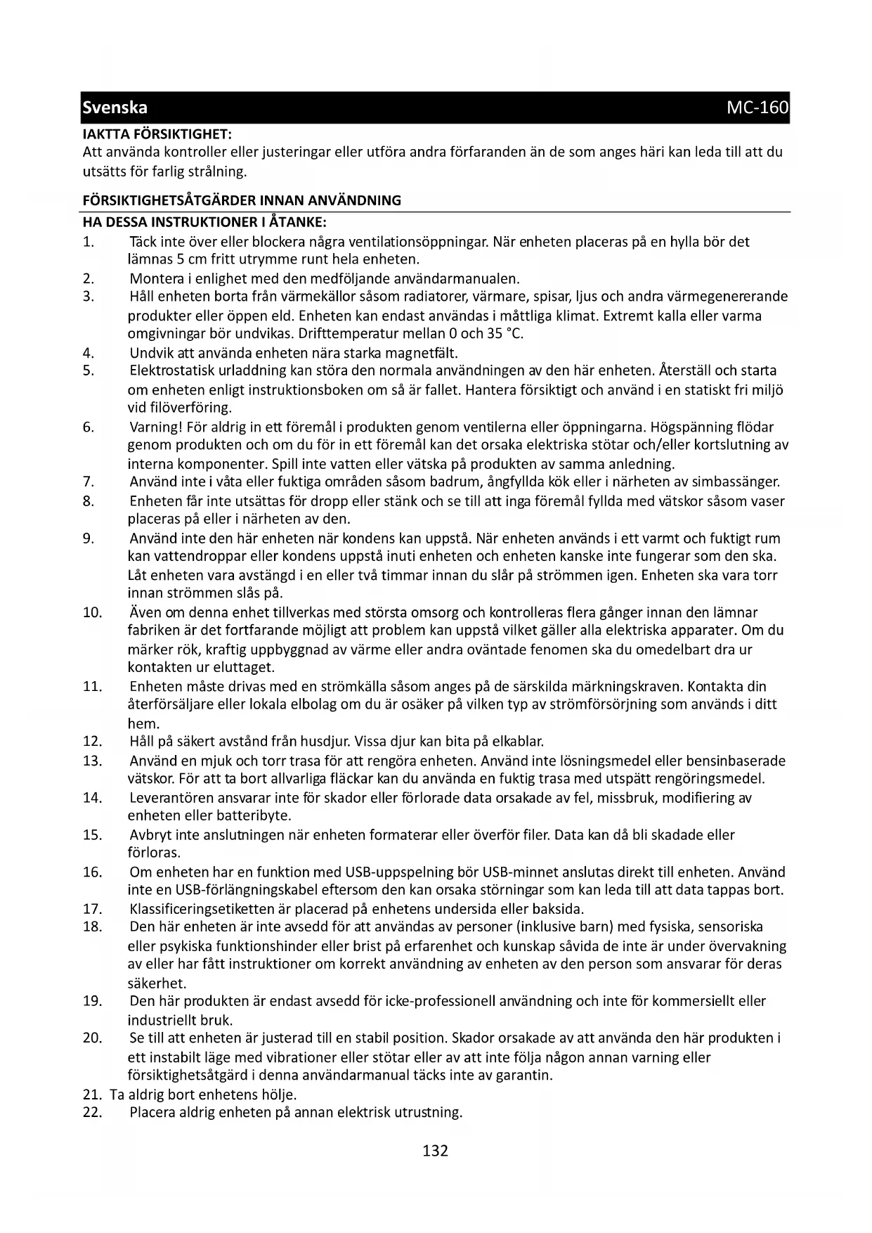 Service Gå ind på www.lenco.com for yderligere oplysninger og support fra vores helpdesk Commaxx B.V. Wiebachstraat 37, 6466 NG Kerkrade, The Netherlands.132 Svenska MC-160 IAKTTA FÖRSIKTIGHET: Att använda kontroller eller justeringar eller utföra andra förfaranden än de som anges häri kan leda till att du utsätts för farlig strålning. FÖRSIKTIGHETSÅTGÄRDER INNAN ANVÄNDNING HA DESSA INSTRUKTIONER I ÅTANKE: