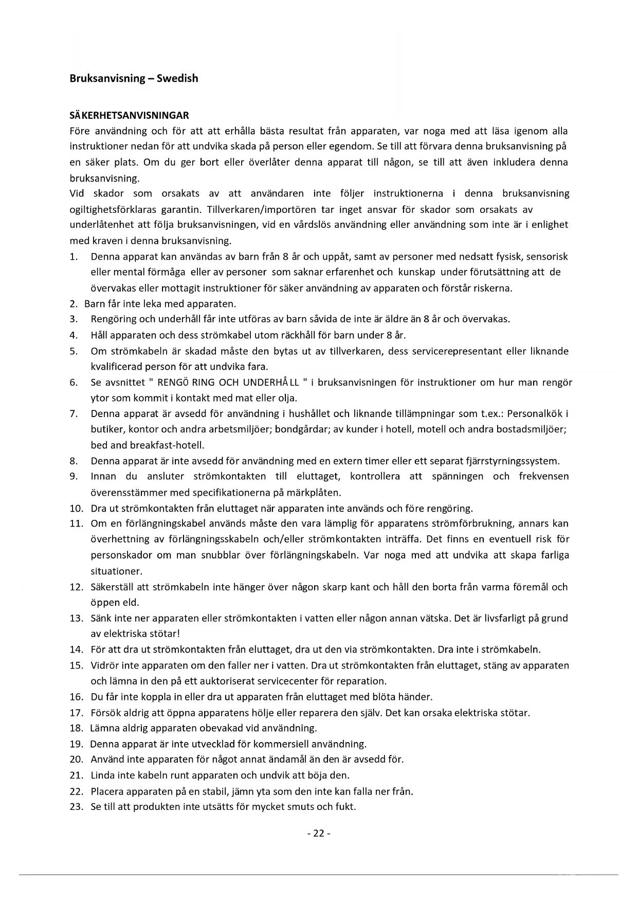 Recyclage – Directive européenne 2012/19/EU Ce symbole indique que le produit ne doit pas être jeté avec les ordures ménagères. Pour limiter les risques pour l’environnement et la santé entraînés par le rejet non contrôlé des déchets, recyclez ce dernier pour promouvoir une réutilisation responsable de ses matériaux. Pour recycler votre produit, utilisez les réseaux de collecte de votre région ou prenez contact avec le revendeur du produit. Ce dernier pourra vous aider à le recycler. Emerio Deutschland GmbH (no service address) Emerio B.V. Customer service: Kundeninformation: Klantenservice: Oudeweg 115 T: +31 (0) 23 3034369 T: +49 (0) 3222 1097 600 T: +31 (0) 23 3034369 2031 CC Haarlem www.emerio.eu/service www.emerio.eu/service www.emerio.eu/service The Netherlands Looking for spare parts? Have a look at https://spareparts.emerio.eu Sie brauchen Ersatzteile? Besuchen Sie https://ersatzteile.emerio.eu Onderdelen nodig? Kijk op https://onderdelen.emerio.eu- 22 - Bruksanvisning – Swedish SÄKERHETSANVISNINGAR Före användning och för att att erhålla bästa resultat från apparaten, var noga med att läsa igenom alla instruktioner nedan för att undvika skada på person eller egendom. Se till att förvara denna bruksanvisning på en säker plats. Om du ger bort eller överlåter denna apparat till någon, se till att även inkludera denna bruksanvisning. Vid skador som orsakats av att användaren inte följer instruktionerna i denna bruksanvisning ogiltighetsförklaras garantin. Tillverkaren/importören tar inget ansvar för skador som orsakats av underlåtenhet att följa bruksanvisningen, vid en vårdslös användning eller användning som inte är i enlighet med kraven i denna bruksanvisning.