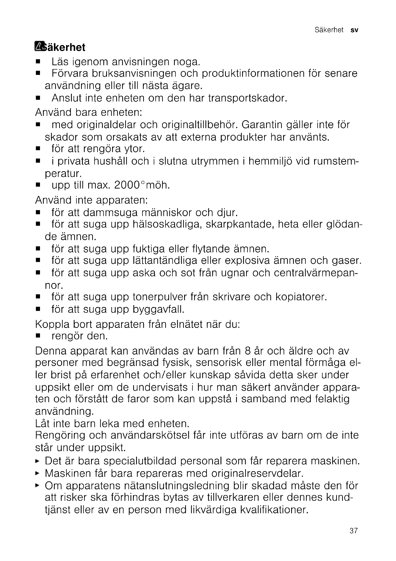 Avhengig av apparatets utstyr 35no Kundeservice rical and electronic equipment – WEEE). Direktivet angir rammene for innlevering og gjenvinning av innbytteprodukter. KundeserviceKundeservice Hos vår kundeservice kan du få funksjons- relevante og lageregnede originale reserve- deler i inntil 10år etter at apparatet ditt kom på markedet. Ta kontakt med kundeservice for nærmere informasjon. Du finner detaljert informasjon om garantitid og garantivilkår i ditt land ved å skanne QR- koden i det vedlagte dokumentet om servicekontakter og garanti, hos kundeservice, forhandler eller på nettsiden vår. Du finner kontaktinformasjonen til kundeservice ved å skanne QR-koden i det vedlagte dokumentet om servicekontakter og garanti eller på nettsiden vår. Du finner informasjonen i henhold til for- skrift (EU) 2023/826 på nettet under www.bosch-home.com på produktsiden og servicesiden til apparatet ditt, i bruksanvis- ningen og tilleggsdokumenter. Informasjon om miljødesignforordningenInformasjon om miljødesign- forordningen Denne støvsugeren er en husholdnings- støvsuger og klassifisert som en universals- tøvsuger. Bruk det utskiftbare universalmunnstykket til rengjøring av tepper. For rengjøring av harde gulv bruker du et munnstykke for harde gulv som er beregnet for rengjøring av harde gulv og testspalter, hvis dette følger med. Ytelsesopplysningene for dette apparatet er basert på måle- og beregningsmetodene i forordning (EU) nr.666/2013 og standardene EN60312-1, EN60704-2-1, EN60335-2-2. 36Säkerhet sv Säkerhet Säkerhet ¡ Läs igenom anvisningen noga. ¡ Förvara bruksanvisningen och produktinformationen för senare användning eller till nästa ägare. ¡ Anslut inte enheten om den har transportskador. Använd bara enheten: ¡ med originaldelar och originaltillbehör. Garantin gäller inte för skador som orsakats av att externa produkter har använts. ¡ för att rengöra ytor. ¡ i privata hushåll och i slutna utrymmen i hemmiljö vid rumstem- peratur. ¡ upp till max. 2000°möh. Använd inte apparaten: ¡ för att dammsuga människor och djur. ¡ för att suga upp hälsoskadliga, skarpkantade, heta eller glödan- de ämnen. ¡ för att suga upp fuktiga eller flytande ämnen. ¡ för att suga upp lättantändliga eller explosiva ämnen och gaser. ¡ för att suga upp aska och sot från ugnar och centralvärmepan- nor. ¡ för att suga upp tonerpulver från skrivare och kopiatorer. ¡ för att suga upp byggavfall. Koppla bort apparaten från elnätet när du: ¡ rengör den. Denna apparat kan användas av barn från 8år och äldre och av personer med begränsad fysisk, sensorisk eller mental förmåga el- ler brist på erfarenhet och/eller kunskap såvida detta sker under uppsikt eller om de undervisats i hur man säkert använder appara- ten och förstått de faror som kan uppstå i samband med felaktig användning. Låt inte barn leka med enheten. Rengöring och användarskötsel får inte utföras av barn om de inte står under uppsikt. Det är bara specialutbildad personal som får reparera maskinen. Maskinen får bara repareras med originalreservdelar. Om apparatens nätanslutningsledning blir skadad måste den för att risker ska förhindras bytas av tillverkaren eller dennes kund- tjänst eller av en person med likvärdiga kvalifikationer. 37sv Förhindra sakskador Använd aldrig skadad enhet. Använd aldrig en apparat med sprucken trasig yta. Dra aldrig i sladden för att göra maskinen strömlös. Dra alltid i kontakten, inte sladden. Dra eller bär aldrig maskinen i sladden. Dra direkt ur sladdens kontakt eller slå av säkringen i proppskå- pet om maskin eller sladd är skadade. Ring service.