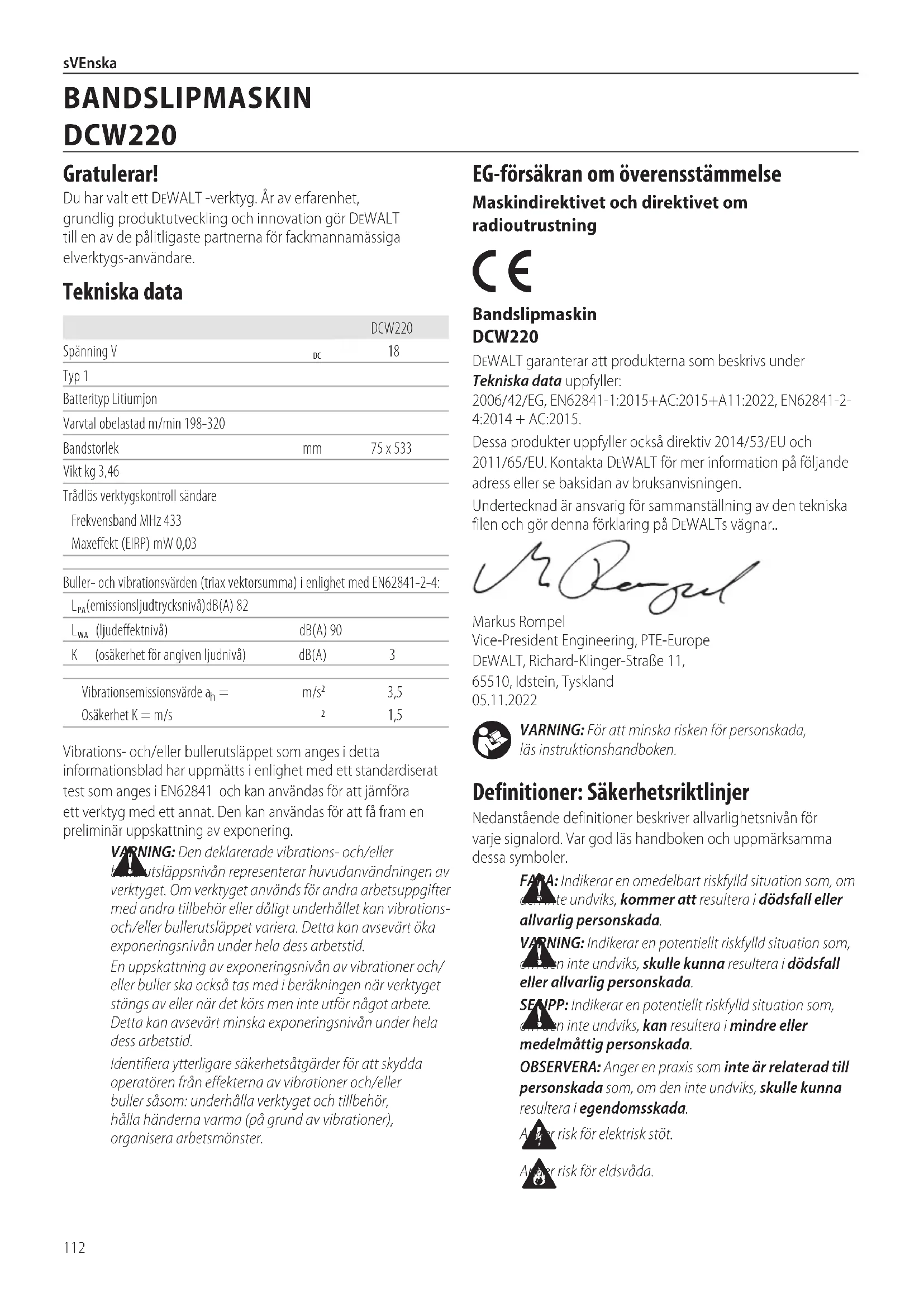3. Varmista, että Tool Connect™ ‑siru on kotelon tasalla. Kiinnitä se kiinnitysruuveilla ja kiristäruuvit.4. Katso lisätietoa Tool Connect™ ‑sirunohjeista.112 sVEnska VARNING: För att minska risken för personskada, läsinstruktionshandboken. Definitioner: Säkerhetsriktlinjer Nedanstående definitioner beskriver allvarlighetsnivån för varje signalord. Var god läs handboken och uppmärksamma dessasymboler. FARA: Indikerar en omedelbart riskfylld situation som, om den inte undviks, kommer att resultera i dödsfall eller allvarligpersonskada. VARNING: Indikerar en potentiellt riskfylld situation som, om den inte undviks, skulle kunna resultera i dödsfall eller allvarligpersonskada. SE UPP: Indikerar en potentiellt riskfylld situation som, om den inte undviks, kan resultera i mindre eller medelmåttigpersonskada. OBSERVERA: Anger en praxis som inte är relaterad till personskada som, om den inte undviks, skulle kunna resultera iegendomsskada. Anger risk för elektriskstöt. Anger risk föreldsvåda. EG‑försäkran om överensstämmelse Maskindirektivet och direktivet om radioutrustning Bandslipmaskin DCW220DeWALT garanterar att produkterna som beskrivs under Tekniska data uppfyller: 2006/42/EG, EN62841‑1:2015+AC:2015+A11:2022, EN62841‑2‑4:2014 + AC:2015.Dessa produkter uppfyller också direktiv 2014/53/EU och 2011/65/EU. Kontakta DeWALT för mer information på följande adress eller se baksidan avbruksanvisningen.Undertecknad är ansvarig för sammanställning av den tekniska filen och gör denna förklaring på DeWALTs vägnar..Markus Rompel Vice‑President Engineering, PTE‑Europe DeWALT, Richard‑Klinger‑Straße 11, 65510, Idstein, Tyskland 05.11.2022Vibrations‑ och/eller bullerutsläppet som anges i detta informationsblad har uppmätts i enlighet med ett standardiserat test som anges i EN62841 och kan användas för att jämföra ett verktyg med ett annat. Den kan användas för att få fram en preliminär uppskattning avexponering. VARNING: Den deklarerade vibrations- och/eller bullerutsläppsnivån representerar huvudanvändningen av verktyget. Om verktyget används för andra arbetsuppgifter med andra tillbehör eller dåligt underhållet kan vibrations- och/eller bullerutsläppet variera. Detta kan avsevärt öka exponeringsnivån under hela dessarbetstid.En uppskattning av exponeringsnivån av vibrationer och/eller buller ska också tas med i beräkningen när verktyget stängs av eller när det körs men inte utför något arbete. Detta kan avsevärt minska exponeringsnivån under hela dessarbetstid.Identifiera ytterligare säkerhetsåtgärder för att skydda operatören från effekterna av vibrationer och/eller buller såsom: underhålla verktyget och tillbehör, hålla händerna varma (på grund av vibrationer), organiseraarbetsmönster.DCW220Spänning V