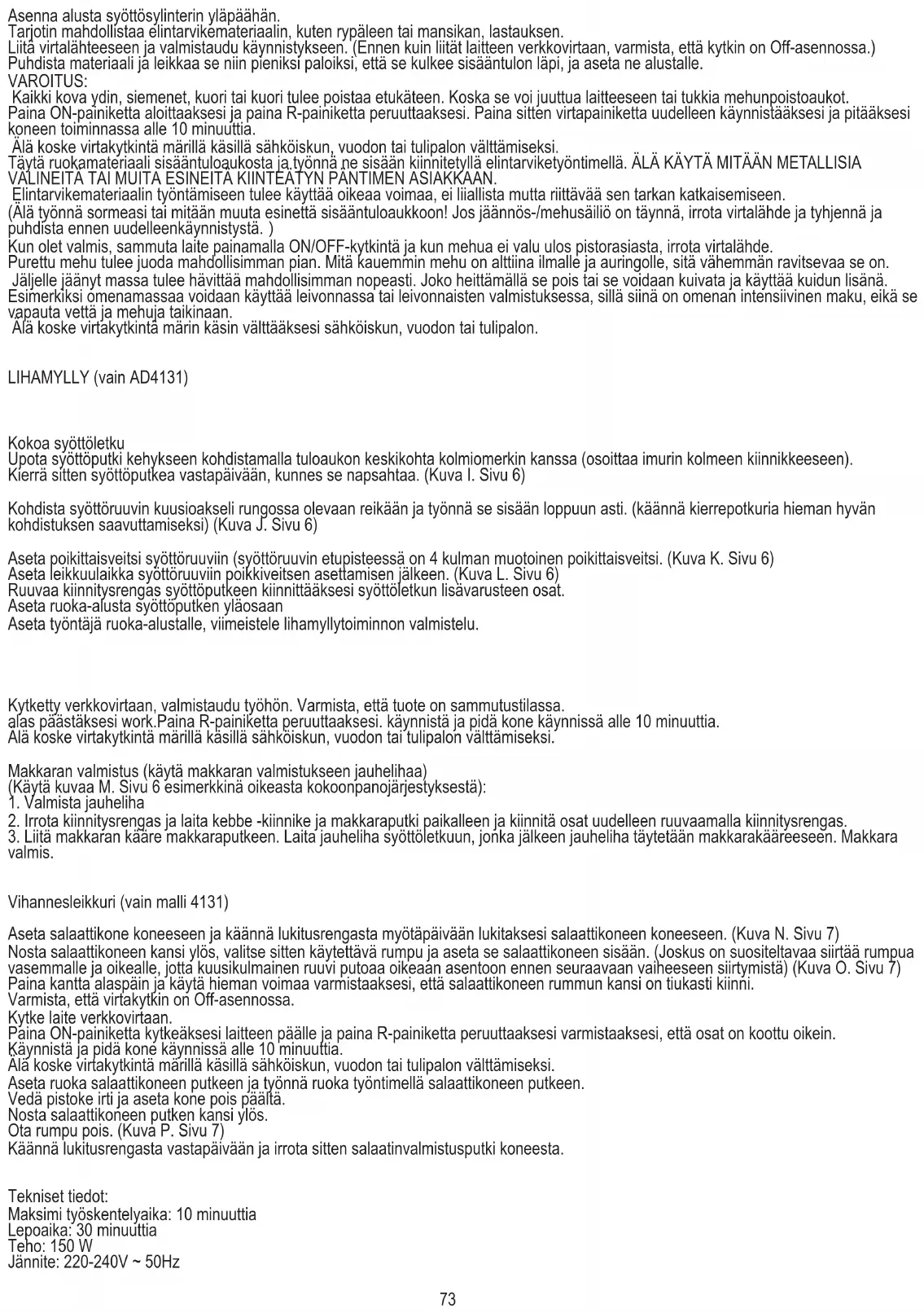 Knappbeskrivning: Enheten har 1 gungomkopplare att manövrera. Switchens 3 funktioner är följande: I: Detta sätter på enheten. Efter att ha tryckt på fortsätter den att fungera tills den stängs av. O : Av-läge. Enheten stängs av när strömbrytaren är i detta läge. R: Omvänt. När den trycks in kommer motorn att backa. Skäraren/skäraren kommer att vrida sig i motsatt riktning jämfört med normal drift. När den släpps växlar enheten till Av-läge. Juice Extractor modeller AD4130 och AD4131: Koppla utdragare till ram. (Bild E. Sida 3) Lägg in utdragaren i ramen genom att rikta in mitten på inloppet med triangelmärket (för att peka på de tre fästena på utdragaren). (Bild E. Sida 3) Vrid sedan utdragaren moturs tills det klickar. (Bild E. Sida 3) Rikta in den sexkantiga axeln på spiralpropellern med hålet i ramen och tryck in den till slutet. (vrid spiralpropellern något för att göra bra inriktning) (Bild F,G . Sida 4) Sätt in den grovhåliga änden av juicefiltret i spiralpropellerns spiral och lås fast de tre fästena i de tre skårorna i extraktorn Passa in de tre fästena på utdragslocket fel med de tre på utdragaren och tryck in dem horisontellt och fäst sedan locket på utdragaren76 genom att vrida det moturs . (Bild H. Sida 4) Placera juicebehållaren bredvid maskinens ram med dess öppning precis under ramens utlopp. (Behållarbaffel bör monteras i behållaren i förväg för att blockera skum i juicen) (Bild H1. Sida 5) Placera restbehållaren under ramens restutlopp, nära juicebehållaren. (Bild H2. Sida 5) Montera brickan på den övre änden av inloppscylindern. Brickan anläggningar lastning av matmaterial, såsom vindruvor eller jordgubbar. Anslut till strömförsörjningen och gör dig redo för start. (Innan du ansluter enheten till elnätet, se till att strömbrytaren är i läge Av.) Rengör materialet och skär det i bitar som är tillräckligt små för att passera genom inloppet och placera dem på brickan. VARNING: Eventuell hård kärna, frö, skal eller skal bör tas bort i förväg. Eftersom det kan fastna i enheten eller blockera juiceextraktionshålen. Tryck ner ON-knappen för att starta och tryck sedan på R-knappen för att backa. Tryck sedan på På-knappen igen för att starta och hålla maskinen igång i mindre än 10 minuter. Rör inte strömbrytaren med våta händer för att undvika elektriska stötar, läckage eller brand. Ladda in matmaterialet genom inloppet och tryck in dem med den bifogade matpåskjutaren. ANVÄND INTE NÅGRA METALLREDSKAP ELLER ANDRA OBJEKT I STÄLLET FÖR DEN ANSLUTADE PUSHERN. Lämplig mängd kraft ska användas för att trycka in matmaterialet, inte överdrivet mycket men tillräckligt för att det ska skäras av exakt. (Ställ inte in fingret eller något annat föremål i inloppet! Om rest-/juicebehållaren är full, koppla ur strömförsörjningen och töm och rengör sedan innan omstart. ) När det är klart, stäng av enheten genom att trycka på ON/OFF-knappen och när ingen juice rinner ut ur uttaget, koppla bort strömförsörjningen. Den extraherade juicen bör drickas så snart som möjligt. Ju längre juicen utsätts för luft och sol desto mindre näringsrik blir den. Den återstående massan ska kasseras så snabbt som möjligt. Antingen genom att slänga den eller så kan den torkas och användas som fibertillskott. Till exempel kan äppelmassa användas för att baka eller göra bakverk eftersom det har den intensiva smaken av äpplen och inte släpper ut vatten och juice i degen. Rör inte strömbrytaren med våta händer för att undvika elektriska stötar, läckage eller brand. KÖTTKVARN (endast AD4131) Sätt ihop matningsslangen Lägg in matarröret i ramen genom att rikta in mitten på inloppet med triangelmärket (för att peka på de tre fästena på utdragaren). Vrid sedan matningsröret moturs tills det klickar. (Bild I. Sida 6) Rikta in den sexkantiga axeln på matarskruven med hålet i ramen och tryck in den till slutet. (vrid spiralpropellern något för att göra en bra inriktning) (Bild J. Sida 6) Sätt tvärkniven på matarskruven (det finns en 4-vinklar form på den främre punkten av matarskruven för att placera korskniven. (Bild K. Sida 6) Sätt skärskivan på matarskruven efter att ha placerat tvärkniven. (Bild L. Sida 6) Skruva fast fixeringsringen på matningsslangen för att fixera delarna av matningsslangstillbehöret. Sätt matbrickan på toppen av matningsröret Sätt påskjutaren på matbrickan, avsluta förberedelsen av köttkvarnsfunktionen. Inkopplad, förbered dig för arbete. Se till att produkten är i avstängningsläge. Tryck ner ON-knappen för att work.tryck på R-knappen för att backa. starta och håll maskinen igång i mindre än 10 minuter. Rör inte strömbrytaren med våta händer för att undvika elektriska stötar, läckage eller brand. Göra korv (Använd köttfärs för att göra korv) (Använd bild M. Sida 6 som exempel på korrekt monteringsordning):