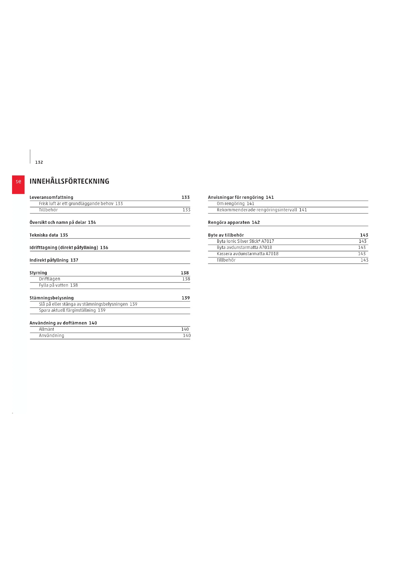 Leveransomfattning 133 Frisk luft är ett grundläggande behov 133 Tillbehör 133 Översikt och namn på delar 134 Tekniska data 135 Idrifttagning (direkt påfyllning) 136 Indirekt påfyllning 137 Styrning 138 Driftlägen 138 Fylla på vatten 138 Stämningsbelysning 139 Slå på eller stänga av stämningsbelysningen 139 Spara aktuell färginställning 139 Användning av doftämnen 140 Allmänt 140 Användning 140 Anvisningar för rengöring 141 Om rengöring 141 Rekommenderade rengöringsintervall 141 Rengöra apparaten 142 Byte av tillbehör 143 Byta Ionic Silver Stick® A7017 143 Byta avdunstarmatta A7018 143 Kassera avdunstarmatta A7018 143 Tillbehör 143133