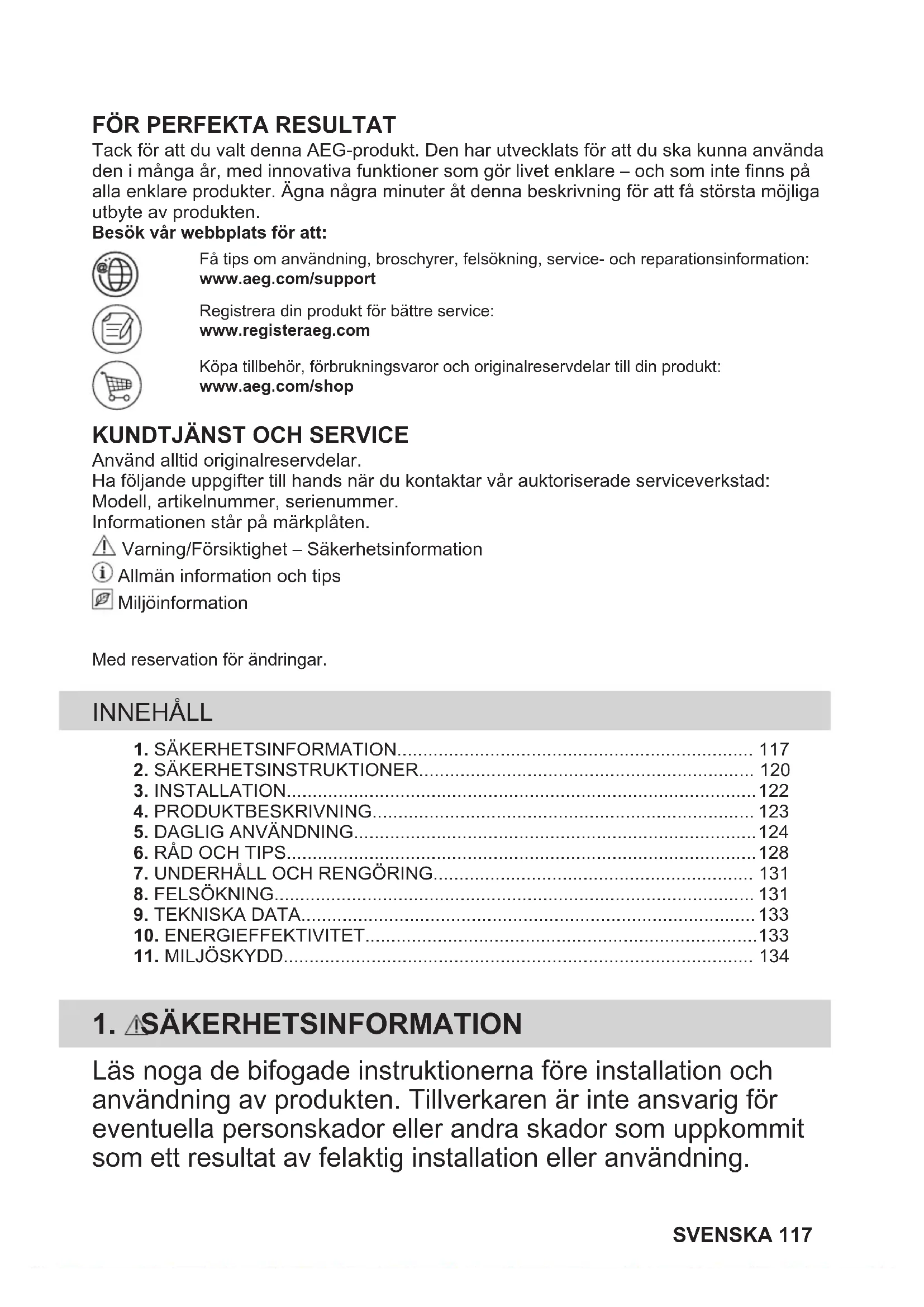 Tack för att du valt denna AEG-produkt. Den har utvecklats för att du ska kunna användaden i många år, med innovativa funktioner som gör livet enklare – och som inte finns påalla enklare produkter. Ägna några minuter åt denna beskrivning för att få största möjligautbyte av produkten.Besök vår webbplats för att:Få tips om användning, broschyrer, felsökning, service- och reparationsinformation:www.aeg.com/supportRegistrera din produkt för bättre service:www.registeraeg.comKöpa tillbehör, förbrukningsvaror och originalreservdelar till din produkt:www.aeg.com/shop