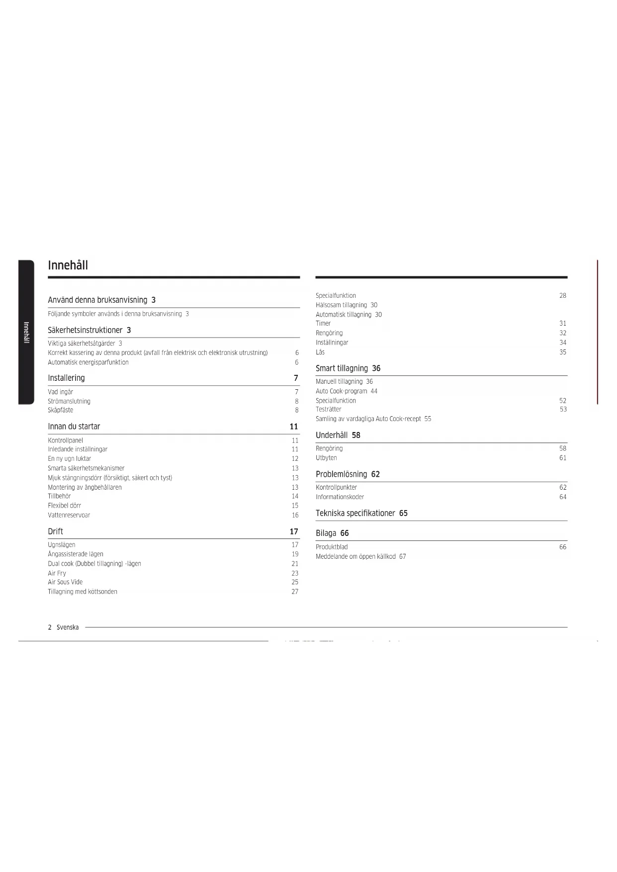 Chamada para a rede xa nacional Dias úteis das 9h às 20h www.samsung.com/pt/support SPAIN 91 175 00 15 www.samsung.com/es/support SWEDEN 0771-400 300 www.samsung.com/se/support SWITZERLAND 0800 726 786 www.samsung.com/ch/support (German) www.samsung.com/ch_fr/support (French) UK 0333 000 0333 www.samsung.com/uk/support IRELAND (EIRE) 0818 717100 www.samsung.com/ie/support DG68-01411A-04Inbyggd ugn Användar- och installationsanvisning NV7B666**** / NV7B667**** / NV7B668**** / NV7B669**** / NV7B676**** / NV7B677**** / NV7B678**** / NV7B679**** / NV7B666**C* / NV7B668**C*2 Svenska Innehåll Specialfunktion 28 Hälsosam tillagning 30 Automatisk tillagning 30 Timer 31 Rengöring 32 Inställningar 34 Lås 35 Smart tillagning 36 Manuell tillagning 36 Auto Cook-program 44 Specialfunktion 52 Testrätter 53 Samling av vardagliga Auto Cook-recept 55 Underhåll 58 Rengöring 58 Utbyten 61 Problemlösning 62 Kontrollpunkter 62 Informationskoder 64 Tekniska specikationer 65 Bilaga 66 Produktblad 66 Meddelande om öppen källkod 67 Innehåll Använd denna bruksanvisning 3 Följande symboler används i denna bruksanvisning 3 Säkerhetsinstruktioner 3 Viktiga säkerhetsåtgärder 3 Korrekt kassering av denna produkt (avfall från elektrisk och elektronisk utrustning) 6 Automatisk energisparfunktion 6 Installering 7 Vad ingår 7 Strömanslutning 8 Skåpfäste 8 Innan du startar 11 Kontrollpanel 11 Inledande inställningar 11 En ny ugn luktar 12 Smarta säkerhetsmekanismer 13 Mjuk stängningsdörr (försiktigt, säkert och tyst) 13 Montering av ångbehållaren 13 Tillbehör 14 Flexibel dörr 15 Vattenreservoar 16 Drift 17 Ugnslägen 17 Ångassisterade lägen 19 Dual cook (Dubbel tillagning) -lägen 21 Air Fry 23 Air Sous Vide 25 Tillagning med köttsonden 27Svenska 3 Använd denna bruksanvisning Säkerhetsinstruktioner Installering av denna ugn skall utföras endast av auktoriserad elektriker. Installatören är ansvarig för att ansluta produkten till elnätet i enlighet med gällande säkerhetsrekommendationer.