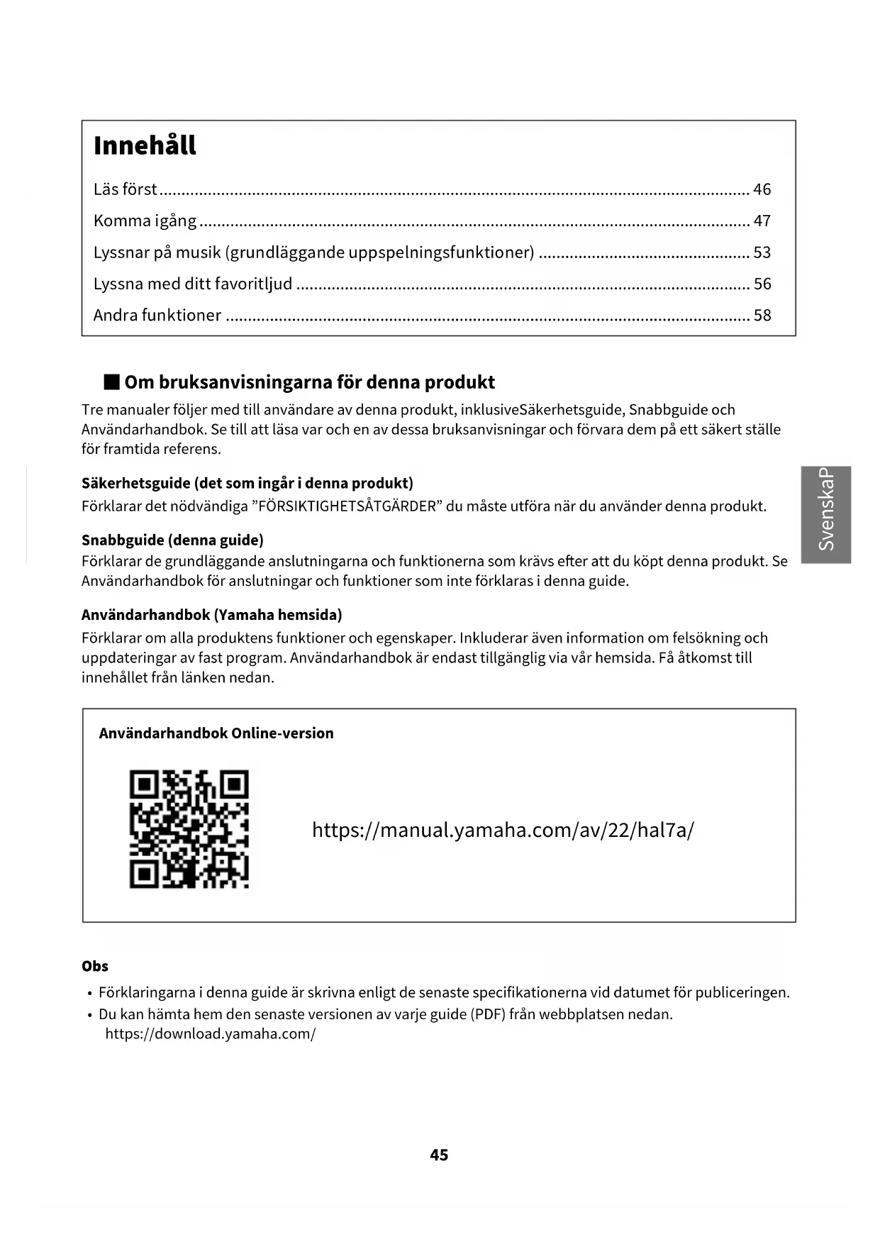 - Firmware-Version prüfen und Gerät initialisieren Weitere oben nicht aufgeführte Themen Firmware-Aktualisierungsfunktion Störungsbeseitigung Technische Daten Benutzerhandbuch Einstellmenü-Liste 44■ Om bruksanvisningarna för denna produkt Tre manualer följer med till användare av denna produkt, inklusiveSäkerhetsguide, Snabbguide och Användarhandbok. Se till att läsa var och en av dessa bruksanvisningar och förvara dem på ett säkert ställe för framtida referens. Säkerhetsguide (det som ingår i denna produkt) Förklarar det nödvändiga ”FÖRSIKTIGHETSÅTGÄRDER” du måste utföra när du använder denna produkt. Snabbguide (denna guide) Förklarar de grundläggande anslutningarna och funktionerna som krävs eer att du köpt denna produkt. Se Användarhandbok för anslutningar och funktioner som inte förklaras i denna guide. Användarhandbok (Yamaha hemsida) Förklarar om alla produktens funktioner och egenskaper. Inkluderar även information om felsökning och uppdateringar av fast program. Användarhandbok är endast tillgänglig via vår hemsida. Få åtkomst till innehållet från länken nedan. Användarhandbok Online-version https://manual.yamaha.com/av/22/hal7a/ Obs