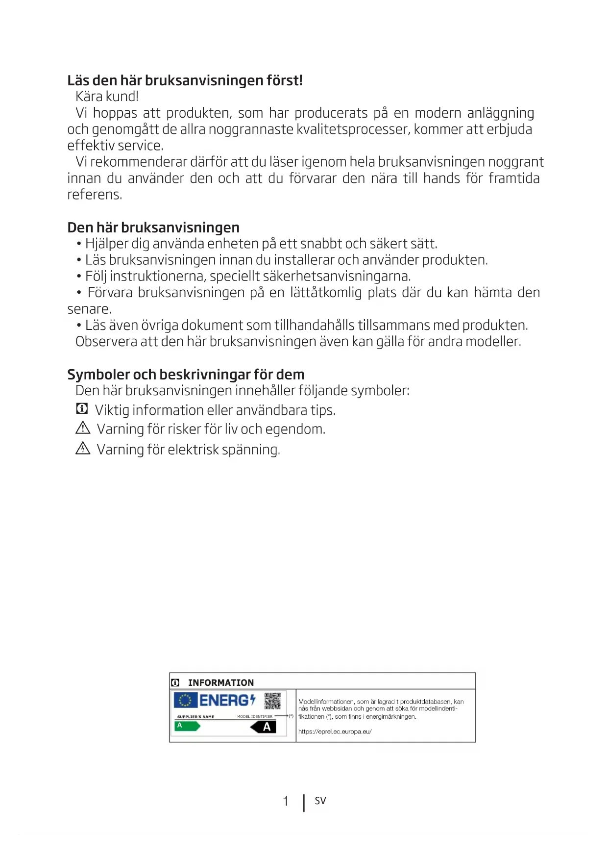 - Läs även övriga dokument som tillhandahålls tillsammans med produkten. Observera att den här bruksanvisningen även kan gälla för andra modeller. Symboler och beskrivningar för dem Den här bruksanvisningen innehåller följande symboler: C Viktig information eller användbara tips. A Varning för risker för liv och egendom. B Varning för elektrisk spänning. INFORMATIONModellinformationen, som är lagrad t produktdatabasen, kan nås från webbsidan och genom att söka för modellindenti-fikationen (*), som finns i energimärkningen.https://eprel.ec.europa.eu/