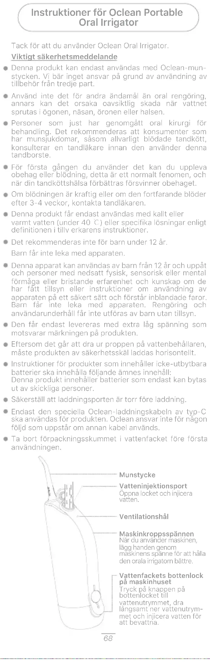 Paprašykite techninės priežiūros ataskaitos iš techninės priežiūros centro ir saugokite ją kartu su garantijos čekiu. „Shenzhen Yunding Information Technology Co., Ltd.“, griežtai laikydamasi buitinių prietaisų priežiūros, keitimo ir pardavimo grąžinimo nuostatų, siūlo garantiją vartotojams, įsigijusiems „Oclean“ burnos irigatorių. Jei nustatoma, kad jūsų įsigytame gaminyje yra gedimas ar brokas, susisiekite su mūsų aptarnavimo linija: servise@mobalt.eu Prekės ženklo savininkas: Shenzhen Yunding Information Technology Co., Ltd. #28G, Building 3, Dachong Business Center (west of Tonggu Road and north of Shennan Avenue), Yuehai Subdistrict, Nanshan District, Shenzhen, China Gamintojas: Shenzhen Risun Technology Co., Ltd. Building A, No.6 of Xinmu Road, Xinmu Community, Pinghu, Shenzhen, China Website: www.oclean.comTack för att du använder Oclean Oral Irrigator. Viktigt säkerhetsmeddelande Denna produkt kan endast användas med Oclean-mun- stycken. Vi bär inget ansvar på grund av användning av tillbehör från tredje part. Använd inte det för andra ändamål än oral rengöring, annars kan det orsaka oavsiktlig skada när vattnet sprutas i ögonen, näsan, öronen eller halsen. Personer som just har genomgått oral kirurgi för behandling. Det rekommenderas att konsumenter som har munsjukdomar, såsom allvarligt blödade tandkött, konsulterar en tandläkare innan den använder denna tandborste. För första gången du använder det kan du uppleva obehag eller blödning, detta är ett normalt fenomen, och när din tandköttshälsa förbättras försvinner obehaget. Om blödningen är kraftig eller om den fortfarande blöder efter 3-4 veckor, kontakta tandläkaren. Denna produkt får endast användas med kallt eller varmt vatten (under 40 ℃) eller specifika lösningar enligt definitionen i tillv erkarens instruktioner. Det rekommenderas inte för barn under 12 år. Barn får inte leka med apparaten. Denna apparat kan användas av barn från 12 år och uppåt och personer med nedsatt fysisk, sensorisk eller mental förmåga eller bristande erfarenhet och kunskap om de har fått tillsyn eller instruktioner om användning av apparaten på ett säkert sätt och förstår inblandade faror. Barn får inte leka med apparaten. Rengöring och användarunderhåll får inte utföras av barn utan tillsyn. Den får endast levereras med extra låg spänning som motsvarar märkningen på produkten. Eftersom det går att dra ur proppen på vattenbehållaren, måste produkten av säkerhetsskäl laddas horisontellt. Instruktioner för produkter som innehåller icke-utbytbara batterier ska innehålla följande ämnes innehåll: Denna produkt innehåller batterier som endast kan bytas ut av skickliga personer. Säkerställ att laddningsporten är torr före laddning. Endast den speciella Oclean-laddningskabeln av typ-C ska användas för produkten. Oclean ansvar inte för någon följd som uppstår om annan kabel används. Ta bort förpackningsskummet i vattenfacket före första användningen. Instruktioner för Oclean Portable Oral Irrigator