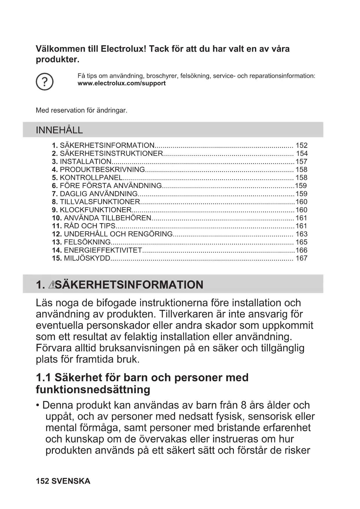 - Denna produkt kan användas av barn från 8 års ålder och uppåt, och av personer med nedsatt fysisk, sensorisk eller mental förmåga, samt personer med bristande erfarenhet och kunskap om de övervakas eller instrueras om hur produkten används på ett säkert sätt och förstår de risker 152 SVENSKAsom är förknippade med användningen. Barn under 8 år eller personer med mycket omfattande och komplexa funktionsnedsättningar ska inte vistas i närheten av produkten utan ständig uppsikt.