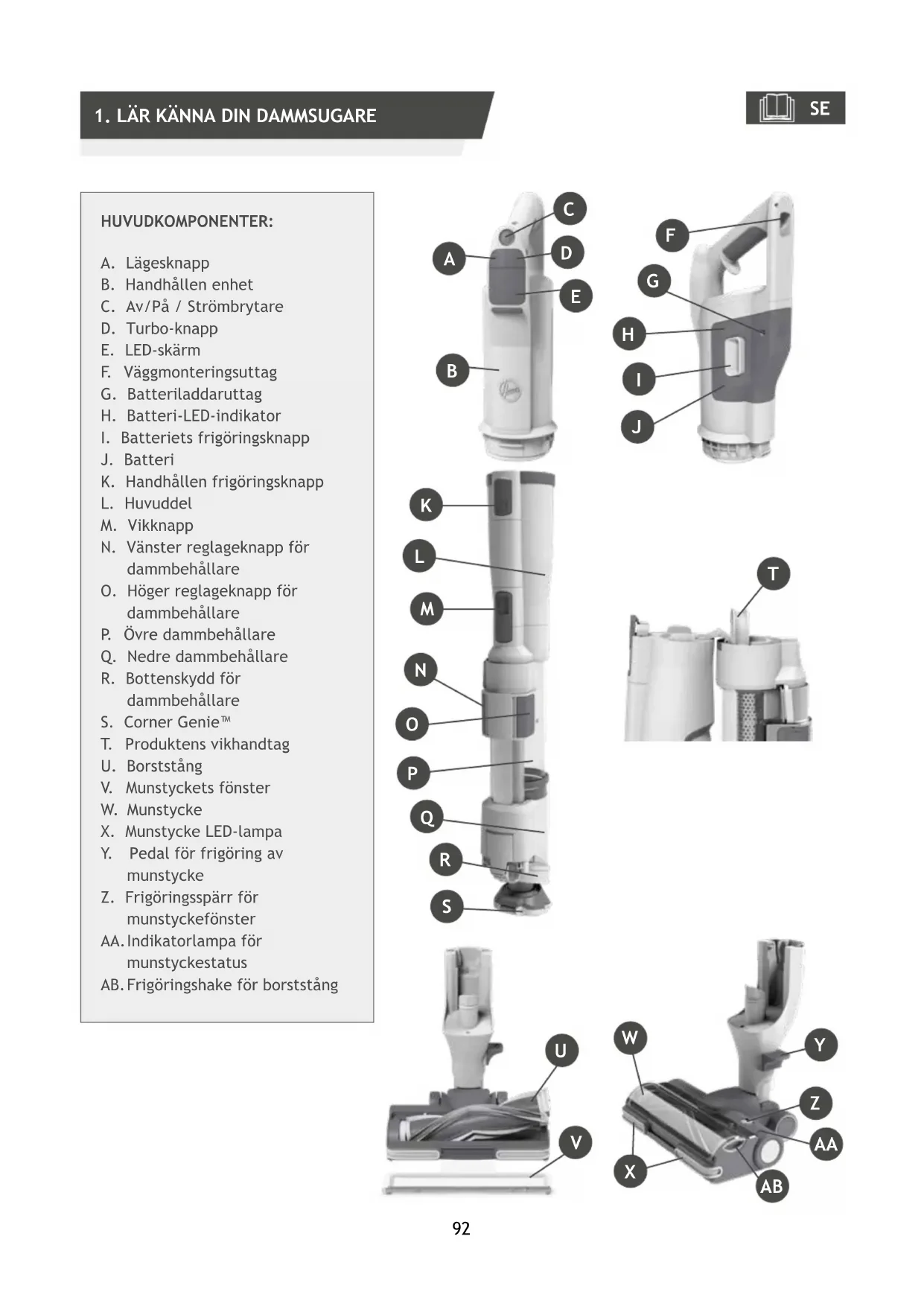 Använd alltid originaldelar från Hoover vid byte. Du kan beställa delar från närmaste Hoover-återförsäljare eller direkt från Hoover. Uppge alltid modellnummer när du beställer delar. Kvalité Hoovers fabriker har kvalitetsbedömts av oberoende organisationer. Våra produkter tillverkas enligt ett kvalitetssystem som uppfyller kraven för ISO 9001. DIN GARANTI Garantivillkoren för produkten denieras av vår representant i det land där produkten säljs. Du kan få uppgifter om aktuella villkor från återförsäljaren. Kvittot måste visas upp när man kräver ersättning enligt garantin. 2 ÅRS BATTERIGARANTI VIKTIGT: Batteriet i den här rengöraren har en garantitid på 2 år från inköpsdatumet. Efter 2 år måste kunden stå för kostnaden av ett nytt batteri. Specikationerna kan ändras utan föregående meddelande. SE101