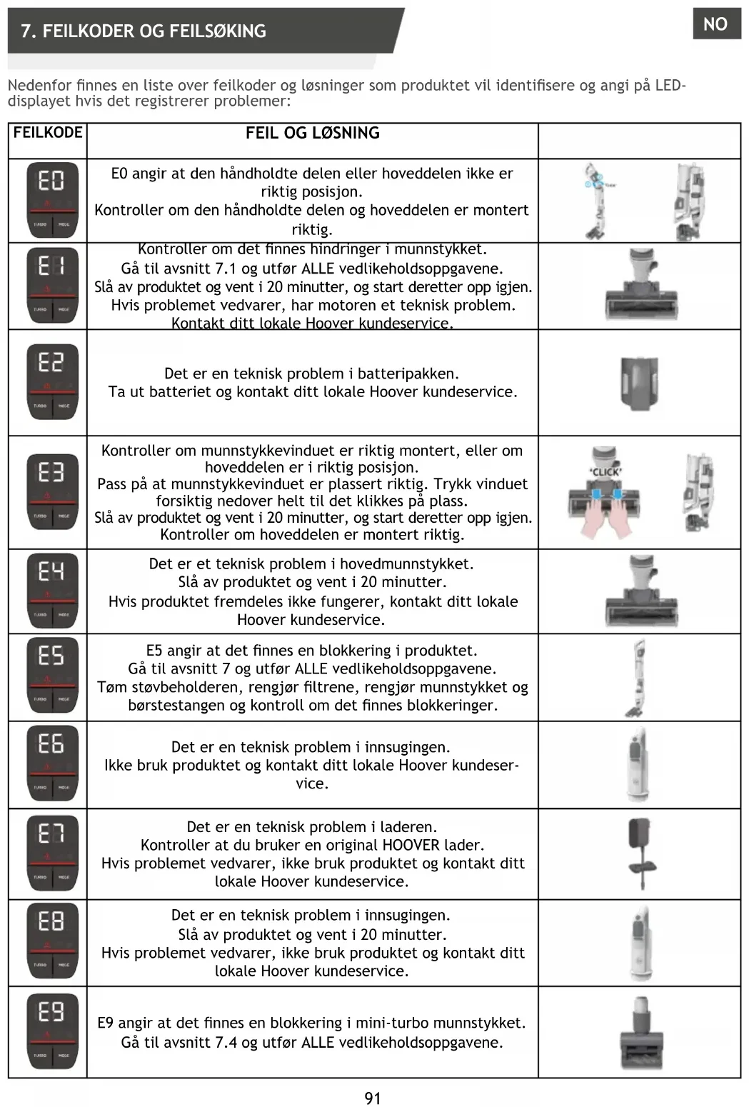 E0 indikerar att den handhållna enheten eller huvuddelen inte är i rätt position. Kontrollera om den handhållna enheten och huvuddelen är korrekt monterade. Kontrollera om det nns något hinder i munstycket. Gå till avsnitt 7.1 och utför ALLA underhållskrav. Stäng av produkten och vänta i 20 minuter, starta sedan om den. Om problemet kvarstår är det ett tekniskt fel på motorn, kontakta ditt lokala Hoover-servicecenter. Det nns ett tekniskt problem i batteripaketet. Ta bort batteriet från din produkt och kontakta ditt lokala Hoover-servicecenter. Kontrollera om munstyckets fönster är korrekt monterat eller om huvuddelen är i rätt position. Se till att munstyckets fönstret sitter korrekt. Tryck försiktigt ned fönstret för att klicka in det säkert. Stäng av produkten och vänta i 20 minuter, starta sedan om den. Kontrollera om huvuddelen är korrekt monterad. Det nns ett tekniskt problem i huvudmunstycket. Stäng av din produkt och vänta i 20 minuter. Om produkten fortfarande inte fungerar, kontakta ditt lokala Hoover-servicecenter. E5 indikerar att det nns en blockering i din produkt. Gå till avsnitt 7 och utför ALLA underhållskrav. Töm behållaren, rengör ltren, rengör munstycket och borststången och kontrollera om det nns blockeringar. Det nns ett tekniskt problem i dammsugaren. Sluta använda din produkt och kontakta ditt lokala Hoover- servicecenter. Det nns ett tekniskt problem i laddaren. Se till att du använder en äkta HOOVER-laddare. Om problemet kvarstår, sluta använda din produkt och kontakta ditt lokala Hoover-servicecenter. Det nns ett tekniskt problem i dammsugaren. Stäng av din produkt och vänta i 20 minuter. Om problemet kvarstår, sluta använda din produkt och kontakta ditt lokala Hoover-servicecenter. E9 indikerar att det nns en blockering i miniturbomunstycket. Gå till avsnitt 7.4 och utför den angivna underhållsuppgiften. SEA