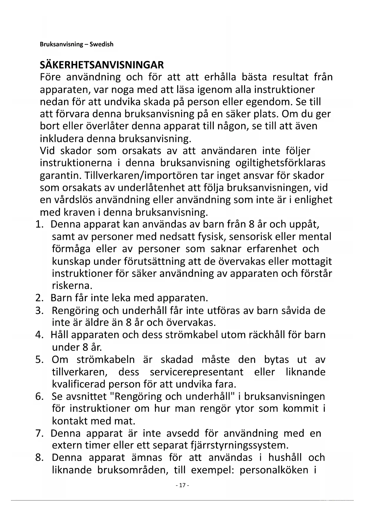 8. Denna apparat ämnas för att användas i hushåll och