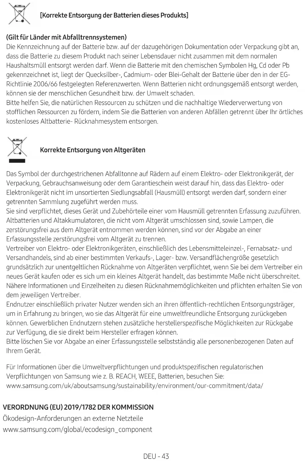 - UTEFFEKT FÖR TRÅDLÖS ENHET Max sändareffekt för RF 100mW vid 2,4GHz – 2,4835GHz 25mW vid 5,725GHz – 5,825GHz [Korrekt avfallshantering av batterierna i produkten] (Gäller i länder med separata insamlingssystem) Denna symbol på batteriet, i manualen eller på förpackningen anger att batterierna i denna produkt inte bör kastas tillsammans med annat hushållsavfall. De kemiska symbolerna Hg, Cd eller Pb visar i förekommande fall att batterierna innehåller kvicksilver, kadmium eller bly i mängder överstigande de gränsvärden som anges i EU-direktivet 2006/66/EG. Om batterierna inte kastas på ett ansvarsfullt sätt kan dessa substanser utgöra en fara för hälsa eller miljö. Hjälp till att skydda miljön och bidra till materialåtervinning genom att sortera batterierna separat från annat avfall och lämna in dem på en återvinningsstation. Korrekt avfallshantering av produkten (elektriska och elektroniska produkter) (Gäller i länder med separata insamlingssystem) Denna symbol på produkten, tillbehören och i manualen anger att produkten och de elektroniska tillbehören (t.ex. laddare, headset, USB-kabel) inte bör sorteras tillsammans med annat hushållsavfall när de kasseras. Dessa föremål bör hanteras separat för ändamålsenlig återvinning av beståndsdelarna för att förhindra fara för hälsa och miljö. Hushållsanvändare bör kontakta återförsäljaren som sålt produkten eller kommunen för vidare information om var och hur produkten och tillbehören kan återvinnas på ett miljösäkert sätt. Företagsanvändare bör kontakta leverantören samt veriera angivna villkor i köpekontraktet. Produkten och de elektroniska tillbehören bör inte hanteras tillsammans med annat kommersiellt avfall. Mer information om Samsungs miljöåtaganden och produktspecika regelverksförpliktelser, t.ex. REACH, WEEE, batterier, nns på: www.samsung.com/uk/aboutsamsung/sustainability/environment/our-commitment/data/