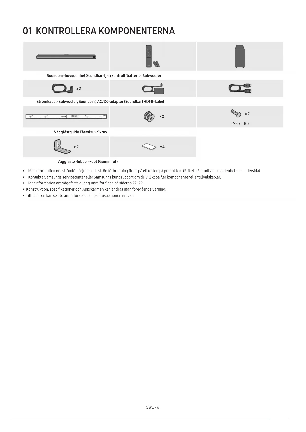 - 13 Felsökning 30 14 Licens 32 15 Licensmeddelande för Open Source 32 16 Viktig information om service 32 17 Specikationer och anvisningar 33 Specikationer SWE - 6 01 KONTROLLERA KOMPONENTERNA VOL WOOFER SOUNDBAR SOUND MODE PAIR Soundbar-huvudenhet Soundbar-fjärrkontroll/batterier Subwoofer x 2 Strömkabel (Subwoofer, Soundbar) AC/DC-adapter (Soundbar) HDMI-kabel x 2 x 2 (M4 x L10) Väggfästguide Fästskruv Skruv x 2 x 4 Väggfäste Rubber-Foot (Gummifot) p. 33