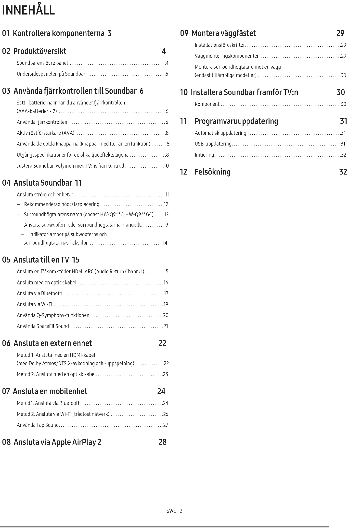 Dolby Atmos®, DTS:X 3.1.2-kanal 5.1.4-kanal Surroundhögtalarna levererar inget tvåkanaligt ljud när läget Standard används. Om du vill aktivera ljud för surroundhögtalarna ska du ändra effektläget till Surround.SWE - 10 Justera Soundbar-volymen med TV:ns fjärrkontroll Styr volymen för Soundbar med fjärrkontrollen till tv:n.