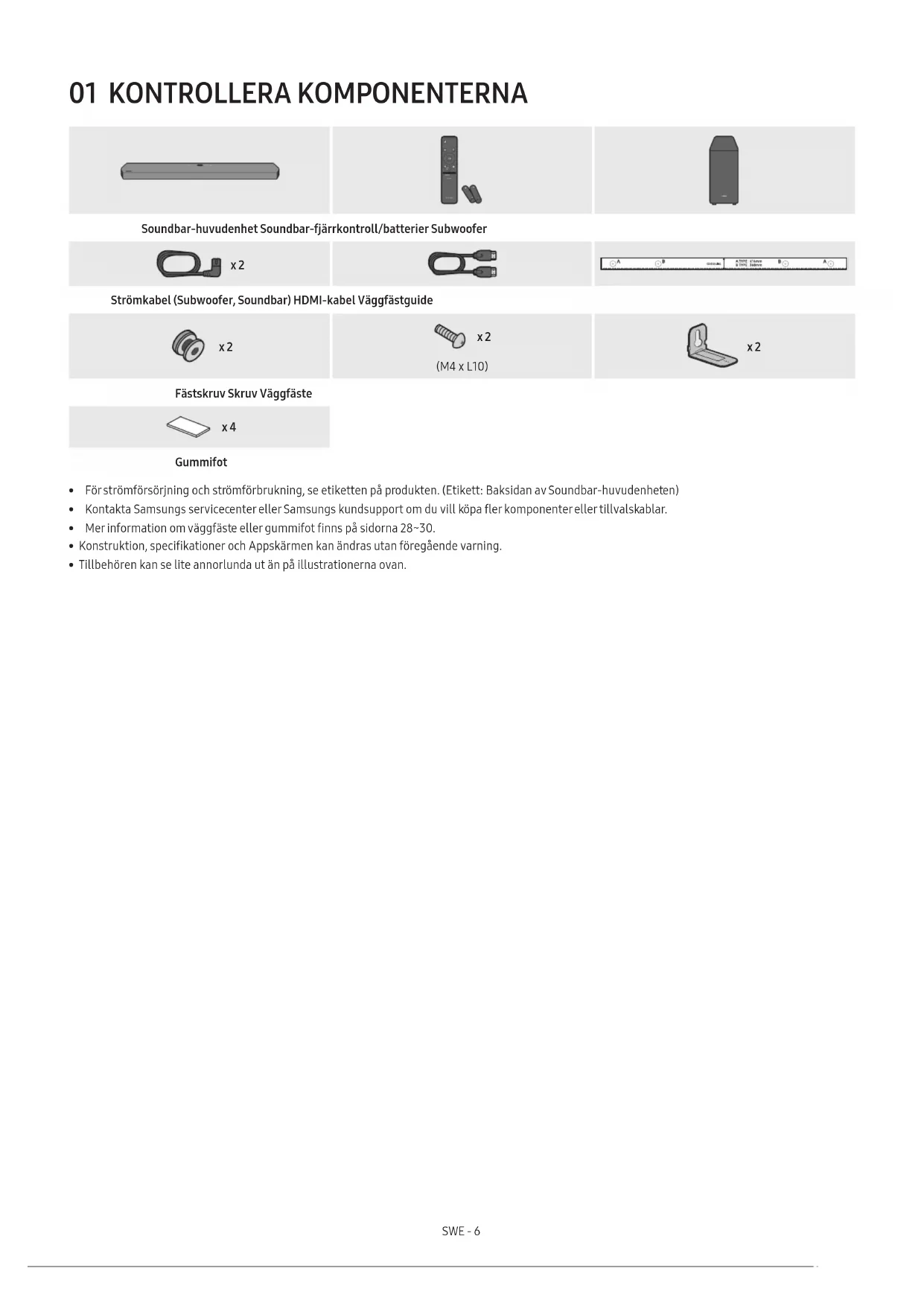 - Ta bort äckar av olja eller vätska genom att använda en ren vit trasa fuktad med vatten. Om äcken är kvar ska du torka av den med en blandning av vatten och ett neutralt rengöringsmedel (t.ex. diskmedel) och en trasa. ‒ Ett icke-neutralt rengöringsmedel kan missfärga eller skada tyget. ‒ Använd en torr trasa eller hårtork för att torka området efter rengöring. ‒ Använd inte för mycket kraft för att undvika missfärgning eller skador på tyget.SWE - 4 INNEHÅLL 01 Kontrollera komponenterna 6 02 Produktöversikt 7 Soundbarens övre panel . . . . . . . . . . . . . . . . . . . . . . . . . . . . . . . . . . . . . . . . . . . . . . . . . . . . . . . . . . . . . . . . . . . . . . . . . . . . . . . . . . . . . . . . . . . . . . . . . . . . . . . . . . . . . . . . . . 7 Undersidespanelen på Soundbar. . . . . . . . . . . . . . . . . . . . . . . . . . . . . . . . . . . . . . . . . . . . . . . . . . . . . . . . . . . . . . . . . . . . . . . . . . . . . . . . . . . . . . . . . . . . . . . . . . . . . . . . . . . 7 03 Använda fjärrkontrollen till Soundbar 9 Sätt i batterierna innan du använder fjärrkontrollen (R6-batterier x 2) . . . . . . . . . . . . . . . . . . . . . . . . . . . . . . . . . . . . . . . . . . . . . . . . . . . . . . . . . . . . . . . . . . . . . . . . 9 Använda fjärrkontrollen. . . . . . . . . . . . . . . . . . . . . . . . . . . . . . . . . . . . . . . . . . . . . . . . . . . . . . . . . . . . . . . . . . . . . . . . . . . . . . . . . . . . . . . . . . . . . . . . . . . . . . . . . . . . . . . . . . . 9 Aktiv röstförstärkare (AVA) . . . . . . . . . . . . . . . . . . . . . . . . . . . . . . . . . . . . . . . . . . . . . . . . . . . . . . . . . . . . . . . . . . . . . . . . . . . . . . . . . . . . . . . . . . . . . . . . . . . . . . . . . . . . . . . 10 Använda de dolda knapparna (knappar med er än en funktion) . . . . . . . . . . . . . . . . . . . . . . . . . . . . . . . . . . . . . . . . . . . . . . . . . . . . . . . . . . . . . . . . . . . . . . . . . . . . 11 Utgångsspecikationer för de olika ljudeffektslägena . . . . . . . . . . . . . . . . . . . . . . . . . . . . . . . . . . . . . . . . . . . . . . . . . . . . . . . . . . . . . . . . . . . . . . . . . . . . . . . . . . . . . . 11 Justera Soundbar-volymen med TV:ns fjärrkontroll . . . . . . . . . . . . . . . . . . . . . . . . . . . . . . . . . . . . . . . . . . . . . . . . . . . . . . . . . . . . . . . . . . . . . . . . . . . . . . . . . . . . . . . . 12 04 Ansluta Soundbar 13 Ansluta ström och enheter . . . . . . . . . . . . . . . . . . . . . . . . . . . . . . . . . . . . . . . . . . . . . . . . . . . . . . . . . . . . . . . . . . . . . . . . . . . . . . . . . . . . . . . . . . . . . . . . . . . . . . . . . . . . . . . 13 ‒ Ansluta subwoofern manuellt . . . . . . . . . . . . . . . . . . . . . . . . . . . . . . . . . . . . . . . . . . . . . . . . . . . . . . . . . . . . . . . . . . . . . . . . . . . . . . . . . . . . . . . . . . . . . . . . . . . . . . . . . 14 ‒ LED-indikatorlampor på baksidan av subwoofern . . . . . . . . . . . . . . . . . . . . . . . . . . . . . . . . . . . . . . . . . . . . . . . . . . . . . . . . . . . . . . . . . . . . . . . . . . . . . . . . . . . . . . . 14 ‒ Auto EQ. . . . . . . . . . . . . . . . . . . . . . . . . . . . . . . . . . . . . . . . . . . . . . . . . . . . . . . . . . . . . . . . . . . . . . . . . . . . . . . . . . . . . . . . . . . . . . . . . . . . . . . . . . . . . . . . . . . . . . . . . . . . . . 15 Ansluta en SWA-9500S (Säljs separat) till din Soundbar . . . . . . . . . . . . . . . . . . . . . . . . . . . . . . . . . . . . . . . . . . . . . . . . . . . . . . . . . . . . . . . . . . . . . . . . . . . . . . . . . . . . 15 05 Använda en kabelanslutning till TV:n 16 Metod 1. Ansluta med HDMI . . . . . . . . . . . . . . . . . . . . . . . . . . . . . . . . . . . . . . . . . . . . . . . . . . . . . . . . . . . . . . . . . . . . . . . . . . . . . . . . . . . . . . . . . . . . . . . . . . . . . . . . . . . . . . 16 ‒ Ansluta en TV som stöder HDMI ARC (Audio Return Channel) . . . . . . . . . . . . . . . . . . . . . . . . . . . . . . . . . . . . . . . . . . . . . . . . . . . . . . . . . . . . . . . . . . . . . . . . . . . . 16 Metod 2. Ansluta med en optisk kabel. . . . . . . . . . . . . . . . . . . . . . . . . . . . . . . . . . . . . . . . . . . . . . . . . . . . . . . . . . . . . . . . . . . . . . . . . . . . . . . . . . . . . . . . . . . . . . . . . . . . . 17 06 Använda en trådlös anslutning till tv:n 18 Metod 1. Ansluta via Bluetooth. . . . . . . . . . . . . . . . . . . . . . . . . . . . . . . . . . . . . . . . . . . . . . . . . . . . . . . . . . . . . . . . . . . . . . . . . . . . . . . . . . . . . . . . . . . . . . . . . . . . . . . . . . . . 18 Metod 2. Ansluta via Wi-Fi. . . . . . . . . . . . . . . . . . . . . . . . . . . . . . . . . . . . . . . . . . . . . . . . . . . . . . . . . . . . . . . . . . . . . . . . . . . . . . . . . . . . . . . . . . . . . . . . . . . . . . . . . . . . . . . . 19 07 Ansluta en extern enhet 20 Metod 1. Ansluta med en HDMI-kabel (med funktion för Dolby Atmos-avkodning och -uppspelning). . . . . . . . . . . . . . . . . . . . . . . . . . . . . . . . . . . . . . . . . . . 20 Metod 2. Ansluta med en optisk kabel. . . . . . . . . . . . . . . . . . . . . . . . . . . . . . . . . . . . . . . . . . . . . . . . . . . . . . . . . . . . . . . . . . . . . . . . . . . . . . . . . . . . . . . . . . . . . . . . . . . . . 21 08 Ansluta en mobilenhet 22 Metod 1. Ansluta via Bluetooth. . . . . . . . . . . . . . . . . . . . . . . . . . . . . . . . . . . . . . . . . . . . . . . . . . . . . . . . . . . . . . . . . . . . . . . . . . . . . . . . . . . . . . . . . . . . . . . . . . . . . . . . . . . . 22 Metod 2. Ansluta via Wi-Fi (trådlöst nätverk). . . . . . . . . . . . . . . . . . . . . . . . . . . . . . . . . . . . . . . . . . . . . . . . . . . . . . . . . . . . . . . . . . . . . . . . . . . . . . . . . . . . . . . . . . . .