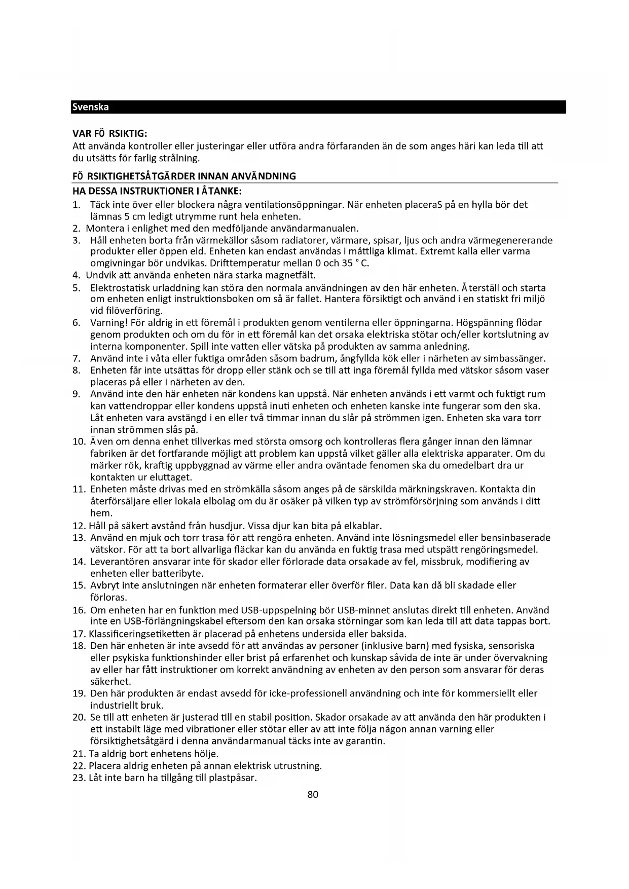 20. Se till att enheten är justerad till en stabil position. Skador orsakade av att använda den här produkten i