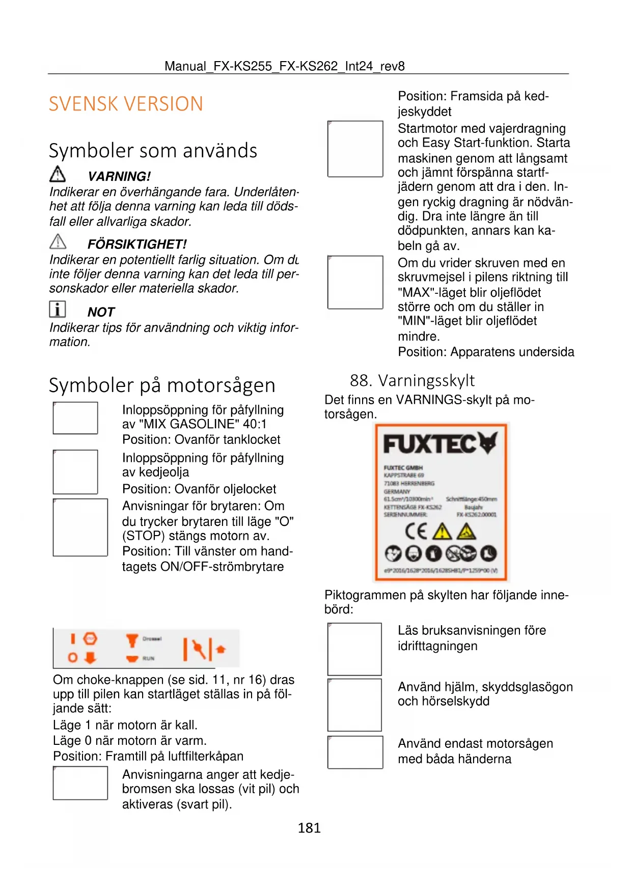 Avsedd användning Motorsågen är avsedd för exklusiv använd- ning: − För kapning av grenar, trädstammar och kvistat virke upp till en diameter som mots- varar längden på den använda kapstån- gen. − För användning i enlighet med beskrivnin- garna och säkerhetsanvisningarna i denna bruksanvisning. ◼ Endast material som är tillverkade av trä får bearbetas. ◼ Tillräcklig skyddsutrustning måste finnas vid användning enligt bruksanvisningen. All annan användning, t.ex. professionell trädvård i trädet, är uttryckligen utesluten. ◼ Användaren/operatören och inte tillverka- ren är ansvarig för skador som uppkom- mer på grund av felaktig användning. End- ast kombinationer av sågkedja och svärd som är lämpliga för maskinen och som an- ges i bruksanvisningen får användas. ◼ Till avsedd användning hör särskilt att alla säkerhets- och driftsinstruktioner i bruksanvisningen följs. Personer som an- vänder och underhåller motorsågen måste känna till den och vara medvetna om och beakta alla möjliga faror. ◼ Dessutom måste de tillämpliga föreskrif- terna för förebyggande av olyckor följas strikt. ◼ De allmänna föreskrifterna för hälsa och säkerhet på arbetsplatsen måste följas strikt. Denna motorsåg är endast avsedd för användning i öppna områden (t.ex. trädgård, skog). ◼ All annan användning är inte förenlig med den avsedda användningen. ◼ Felaktig användning gör garantin ogiltig och leder till att tillverkaren frånsäger sig allt ansvar. ◼ Användaren är ansvarig för alla skador på tredje part och deras egendom. ◼ Använd endast apparaten i det tekniska skick som specificerats och levererats av tillverkaren.Manual_FX-KS255_FX-KS262_Int24_rev8