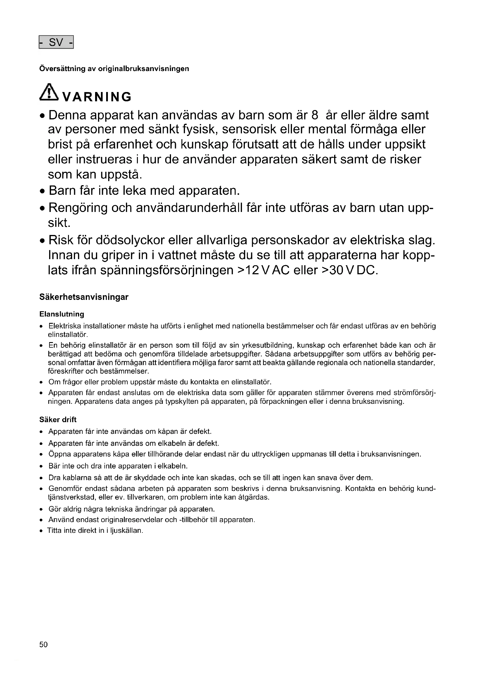 - Risk för dödsolyckor eller allvarliga personskador av elektriska slag. Innan du griper in i vattnet måste du se till att apparaterna har kopp- lats ifrån spänningsförsörjningen >12 V AC eller >30 V DC.