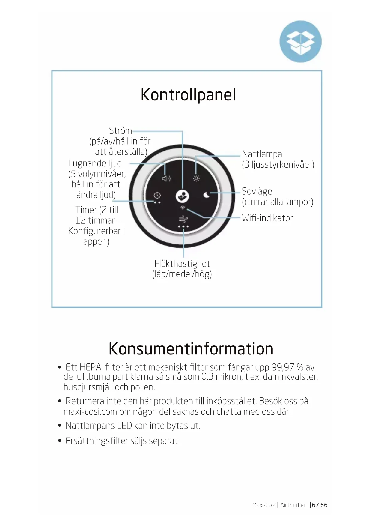- Ersättningsfilter säljs separat Kontrollpanel Fläkthastighet (låg/medel/hög) Wifi-indikator Ström (på/av/håll in för att återställa) Timer (2 till 12timmar – Konfigurerbar i appen) Lugnande ljud (5volymnivåer, håll in för att ändra ljud) Sovläge (dimrar alla lampor) Nattlampa (3ljusstyrkenivåer)Maxi-Cosi
