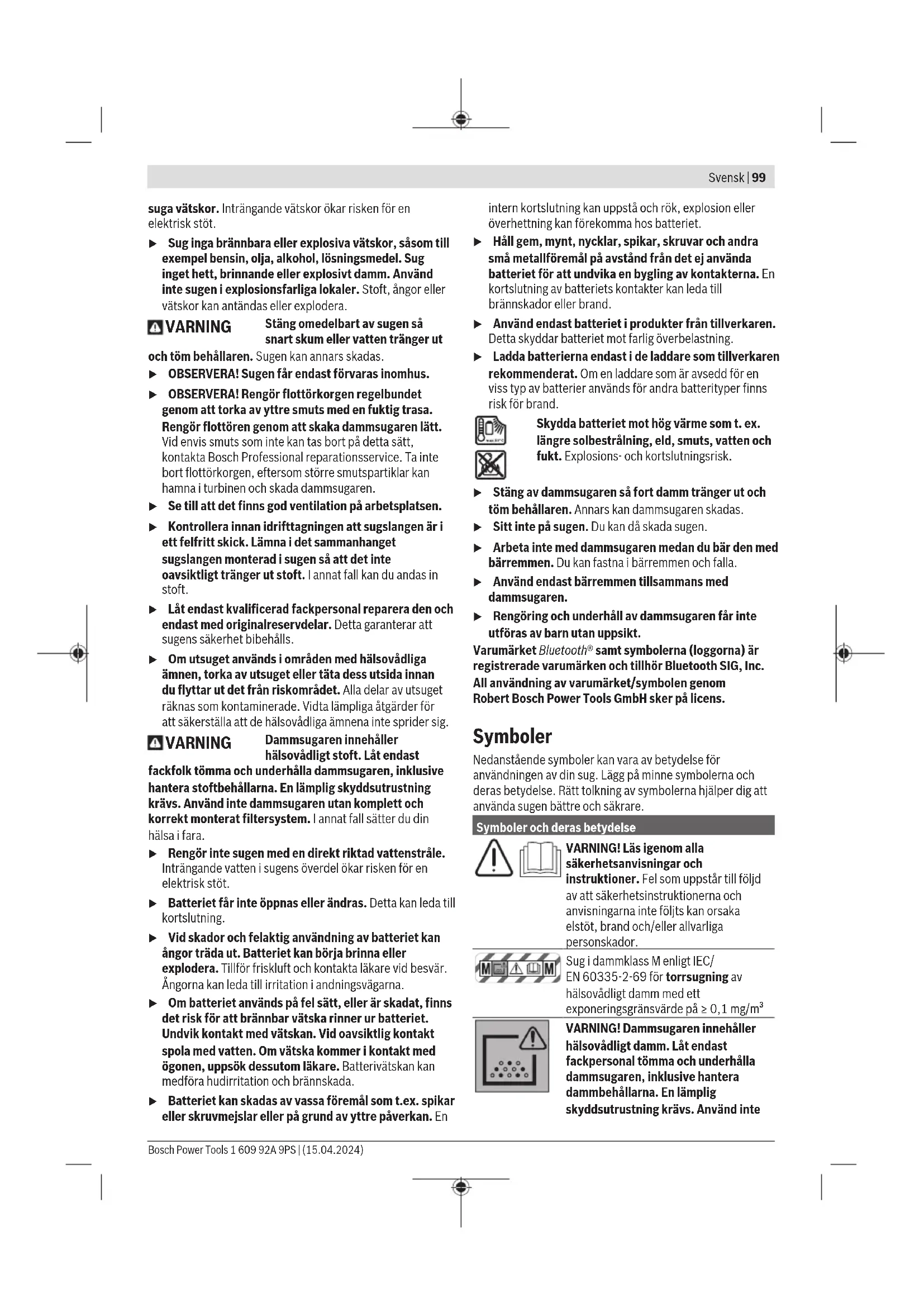 Batteri Bosch säljer också sladdlösa dammsugare utan batteri. Du kan se på förpackningen om ett batteri ingår i leveransomfattningen för din dammsugare. Ladda batteriet u Använd endast de laddare som anges i tekniska data. Endast dessa laddare är anpassade till det lithiumjon- batteri som används på din sug. Observera: litiumjonbatterier levereras delvis laddade enligt internationella transportföreskrifter. För full effekt ska batteriet laddas helt innan första användningen. Sätta in och ta ut batteriet (sebildA) u Använd inte våld när du sätter i batteriet. Batteriet är konstruerat så att det bara kan sättas in på rätt håll i sugen. u Håll batterifacket och batterischaktet rena och torra för bra och säkert arbete. – Tryck på upplåsningsknappen (19) för att öppna batterifackets lock (18). – Skjut in batteriet (31) i batterischaktet (30) tills det klickar fast hörbart. – För att ta ut batteriet (31), tryck på upplåsningsknappen på batteriet och dra ut det ur batterischaktet (30). – Stäng batterirackets lock (18). Observera: På grund av filterrengöringssystemet krävs mer kraft för att stänga batterifackets lock. Batteristatusindikator När batteriet är isatt kan du se batteriets laddningsnivå i användargränssnittet(6) när batteriet tagits ut kan du se det på själva batteriet. Batteristatusindikator på dammsugaren Efter att dammsugaren satts på tänds fem gröna LED-lampor på batteristatusindikatorn(3) i användargränssnittet enskilt stigande och fallande. Därefter visar LED:erna batteriets(31) laddningsstatus. Batteristatusindikator på batteriet Om batteriet tas ut ur dammsugaren kan laddningsnivån visas via de gröna LED-lamporna på batteriet. Tryck på knappen för indikering av batteristatus eller för att visa batteriets laddningsnivå. Om ingen LED-lampa lyser efter ett tryck på knappen för batteristatus är batteriet defekt och måste bytas ut. Observera: Inte varje batterityp har en laddningsindikation. Bosch Power Tools 1 609 92A 9PS | (15.04.2024)102 | Svensk Batterityp GBA 18V... LED Kapacitet Fast ljus 3× grönt 60−100% Fast ljus 2× grönt 30−60% Fast ljus 1× grönt 5−30% Blinkande ljus 1× grön 0−5% Batterityp ProCORE18V... LED Kapacitet Fast ljus 5× grönt 80−100 % Fast ljus 4× grönt 60−80 % Fast ljus 3× grönt 40−60 % Fast ljus 2× grönt 20−40 % Fast ljus 1× grönt 5−20 % Blinkande ljus 1× grön 0−5 % Anvisningar för korrekt hantering av batterimodulen Skydda batterimodulen mot fukt och vatten. Batteriet får endast lagras inom ett temperaturområde mellan –20 °C till 50 °C. Låt därför inte batterimodulen t. ex. på sommaren ligga kvar i bilen. Rengör vid tillfälle batterimodulens ventilationsöppningar med en mjuk, ren och torr pensel. Är brukstiden efter uppladdning onormalt kort tyder det på att batterierna är förbrukade och måste bytas mot nya. Beakta anvisningarna för avfallshantering. Montage u Ta bort batteriet innan du utför underhåll på sugen eller rengör den, utför inställningar, byter tillbehör eller förvarar den. Denna skyddsåtgärd förhindrar oavsiktlig start av dammsugaren. Sätt in huvudfiltret (sebildB) Huvudfiltret (32) är ett HEPA-veckfilter med extra hög fibereffekt, för rengöring av utblåsluft. – Öppna förslutningarna (13) och ta av sugöverdelen (15). Observera: När du tar av och ställer ifrån dig dammsugarens överdel(15), se till att påshållarens(33) stänger inte böjs eller bryts av. – Stjälp huvudfiltret(32) över flottörkorgen(34) och vrid den till anslag i rotationsriktning i filterhållaren(35). – Sätt på sugöverdelen (15) och stäng förslutningarna (13). Observera: Se till att filtret alltid är korrekt monterat. Detta gäller i synnerhet när du suger upp skadligt damm. Sätta in/ta ut plastsäcken (torrsugning) (sebildC) Observera: När du tar av och ställer ifrån dig dammsugarens överdel(15), se till att påshållarens(33) stänger inte böjs eller bryts av. Öppna de båda förslutningarna(13) och ta av dammsugarens överdel(15). För torrsugning sätter du en plastsäck(36) i behållaren(12). Lägg plastsäcken(36) med påfyllningsöppningen uppåt i behållaren(12)➊. Se till att plastsäcken(36) ligger an helt mot behållarens(12) ➋innerväggar. Vik resten av plastsäcken(36) över kanten på behållaren(12). Sätt på dammsugarens överdel(15) igen➌ och stäng dammsugaren med spärrarna(13). u Se till att dammsugaren alltid är ordentligt stängd. Observera: När du sätter på dammsugarens överdel(15), se till att stängerna på påshållaren(33) inte sticker hål på plastsäcken (36). Stäng plastsäcken innan du tar ut den. Dra av det vita bandet från plastsäcken, håll ihop säcken upptill och använd bandet för att knyta ihop säcken. Montera hållare för sugtillbehör Sätt in hållaren för sugtillbehöret(7) i avsedd hållare. Spärra hållaren för sugtillbehöret(7) genom att vrida spärren för tillbehörshållaren(8) medsols. Montera/sätta fast sugslangen Montera dammsugarslangen (sebildD) Dra ut pluggen(11) ur slanghållaren(10). Sätt på dammsugarslangen(20) på dammsugarmunstycket(10) och vrid den medsols till anslaget. u Stäng alltid utsugsanslutningen med pluggen när du tar av sugslangen. Det förhindrar att damm tränger ut. Sätta fast sugslangen på dammsugaren (sebildE) Linda den monterade sugslangen(20) runt dammsugaren. Dra spännbandet(9) neråt och haka fast det i ett av de tre tillgängliga spåren (av15). Montera sugtillbehör Sugslangen (20) är utrustad med ett klämsystem med vilket sugtillbehöret (utsugsadapter (21), det böjda munstycket (22)) kan anslutas. 1 609 92A 9PS | (15.04.2024) Bosch Power ToolsSvensk | 103 Montera utsugsadaptern eller det böjda munstycket (sebildF) Sätt utsugsadaptern(21) eller det böjda munstycket(22) på utsugsslangen(20), tills de båda knapparna (37) på utsugsslangen klickar fast hörbart. För att demontera