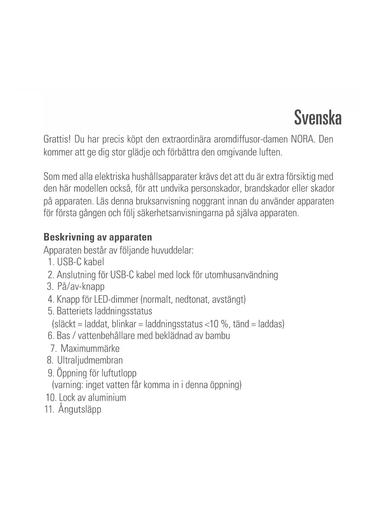 - Vid reparation måste följande punkter beaktas innan apparaten skickas eller tas till återförsäljaren: Töm ut allt vatten ur apparaten (vattentråg och eventu- ell vattentank) och låt apparaten torka helt. Apparaten skadas om den trans- porteras med restvatten i. Garantin upphör då att gälla.Kassering Det europeiska direktivet 2012 / 19 / CE om avfall från elektrisk och elektronisk utrustning (WEEE), kräver att gammal hushållselektronik INTE kastas i det nor- mala osorterade avfallet. Förbrukad utrustning måste samlas in separat för att optimera återanvändning och återvinning av det material som de innehåller och för minska påverkan på människors hälsa och på miljön. Symbolen med den över- korsade ”soptunnan” på produkten påminner dig om din skyldighet att apparaten måste samlas in separat när det kasseras. Du kan kontakta din lokala myndighet eller återförsäljare för information om korrekt kassering av förbrukad elektronisk utrustning. Batteriernas avfallshantering: Enheten innehåller ett laddningsbart batteri som inte kan bytas. När batteriet har nått slutet på sin livs- längd, ska enheten avfallshanteras i enlighet med föreskrifterna. Släng dem inte i papperskorgen, elektroden är insvept i isolerande papper och kan återvinnas och återanvändas.Specifikationer Märkspänning DC 5 V Utgående effekt 3 W Drifttiden upp till 7 timmars batteridrift, upp till 18 timmar med strömförsörjning Mått 101 x 83 mm (diameter x höjd) Vikt 300 g Tankkapacitet 90 ml Ljudnivå < 26 dB(A) Batteriladdningens temperaturområde 0–45 °C, Luftfuktighet ≤85 % RH Batterimodell YY-1S2P18650 -5200mAh Uppfyller direktiven CE / WEEE / RoHS / EAC / UKCA Alla rättigheter för tekniska ändringar förbehållesРусский Поздравляем! Вы приобрели необыкновенный ароматический диффузор NORA. Использование этого устройства позволит улучшить воздух в по- мещении, а эксплуатация доставит несомненное удовольствие. При эксплуатации ароматизатора воздуха, а также иных электроприбо- ров, следует обращать особое внимание на меры безопасности. Прежде, чем использовать этот электроприбор, внимательно прочтите инструкцию. Во избежание травм или повреждений имущества, строго следуйте приведенным в данной инструкции рекомендациями. Описание устройства Устройство состоит из следующих компонентов:
