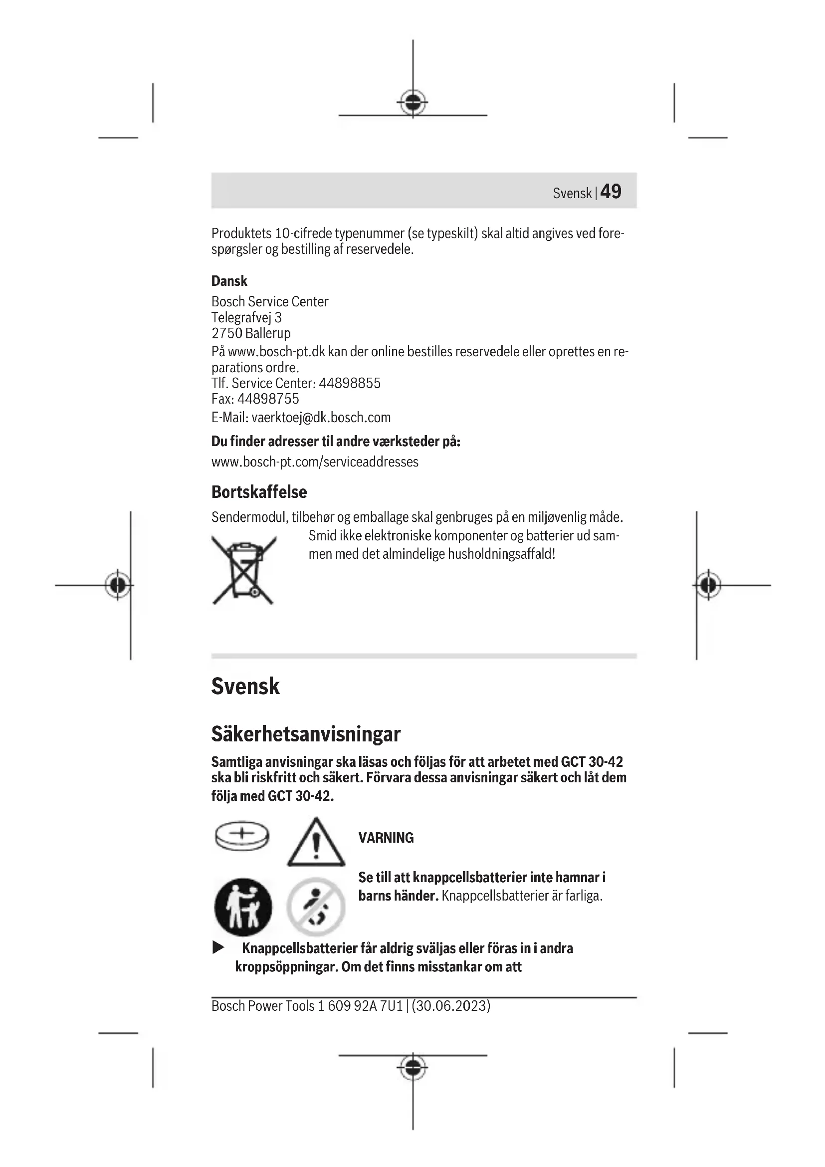 Vedligeholdelse og service Vedligeholdelse og rengøring Fjern snavs med en pensel eller en fugtig klud. Brug ikke rengørings- eller op- løsningsmiddel. Udskiftning af knapcellebatteri u Bemærk! Udskift altid knapcellebatteriet med et knapcellebatteri af samme type. Fare for eksplosion. u Fjern og bortskaf afladede knapceller iht. reglerne. Afladede knapcel- ler kan blive utætte og derved beskadige produktet eller kvæste personer. – Åbn batteridækslet på bagsiden af sendermodulet med en mønt. – Tag forsigtigt knapcellebatteriet ud, og sæt et nyt knapcellebatteri i. Sørg for at vende knapcellebatteriet rigtigt. – Luk batteridækslet igen, og lås det med en mønt. Drej dækslet, indtil det ikke kan komme længere, så det er sikkert lukket. Kundeservice og anvendelsesrådgivning Kundeservice besvarer dine spørgsmål vedr. reparation og vedligeholdelse af dit produkt samt reservedele. Eksplosionstegninger og oplysninger om reser- vedele finder du også på: www.bosch-pt.com Bosch-anvendelsesrådgivningsteamet hjælper dig gerne, hvis du har spørgs- mål til produkter og tilbehørsdele. 1 609 92A 7U1 | (30.06.2023) Bosch Power ToolsSvensk | 49Produktets 10‑cifrede typenummer (se typeskilt) skal altid angives ved fore-spørgsler og bestilling af reservedele.DanskBosch Service Center Telegrafvej 3 2750 Ballerup På www.bosch-pt.dk kan der online bestilles reservedele eller oprettes en re-parations ordre. Tlf. Service Center: 44898855Fax: 44898755 E-Mail: vaerktoej@dk.bosch.comDu finder adresser til andre værksteder på:www.bosch-pt.com/serviceaddresses Bortskaffelse Sendermodul, tilbehør og emballage skal genbruges på en miljøvenlig måde.Smid ikke elektroniske komponenter og batterier ud sam-men med det almindelige husholdningsaffald! Svensk Säkerhetsanvisningar Samtliga anvisningar ska läsas och följas för att arbetet medGCT 30-42ska bli riskfritt och säkert. Förvara dessa anvisningar säkert och låt demfölja medGCT 30-42.VARNINGSe till att knappcellsbatterier inte hamnar ibarns händer. Knappcellsbatterier är farliga. u Knappcellsbatterier får aldrig sväljas eller föras in i andra kroppsöppningar. Om det finns misstankar om attBosch Power Tools 1 609 92A 7U1 | (30.06.2023)50 | Svensk knappcellsbatteriet har förtärts eller förts in i en annan kroppsöppning ska du omedelbart uppsöka läkare. Förtäring av knappcellsbatteriet kan leda till allvarliga inre frätskador och dödsfall inom 2 timmar. u Var noga med att byta ut knappcellsbatteriet på rätt sätt. Explosionsrisk föreligger. u Använd endast de knappceller, som anges i denna bruksanvisning. Använd inga andra knappceller eller annan energiförsörjning. u Försök inte att ladda upp knappcellen igen och kortslut den inte. Knappcellen kan bli otät, explodera, brinna och skada personer. u Avlägsna och avfallshantera urladdade knappceller på korrekt sätt. Urladdade knappceller kan bli otäta och därigenom skada mätverktyget eller personer. u Överhetta inte knappcellen och kasta den inte i eld. Knappcellen kan bli otät, explodera, brinna och skada personer. u Skada inte knappcellen och plocka inte isär den. Knappcellen kan bli otät, explodera, brinna och skada personer. u En skadad knappcell får inte komma i kontakt med vatten. Utträdande litium kan tillsammans med vatten generera väte och därmed förorsaka en brand, explosion eller personskador. Varumärket Bluetooth® och logotyperna tillhör Bluetooth SIG, Inc. Alla användning av detta varumärke/logotyp från Robert Bosch Power Tools GmbH sker under licens. Montera aldrig sändarmodulen på ställen som krävs för användning av det sladdlösa verktyget (t.ex. greppytor, brytare, indikatorer). Produkt- och prestandabeskrivning Ändamålsenlig användning Sändarmodulen GCT30-42 skapar en start-/stopp-signal för en dammsugare. Denna signal kan överföras antingen till en Bosch Professional dammsugare med Auto-Start-funktion eller till mottagarmodulen GCA30-42. Ytterligare information finns i bruksanvisningarna för Bosch Auto-Start- systems GCA 30-42 + GCT 30-42 och den dammsugare som används. Illustrerade komponenter Numreringen av de avbildade komponenterna hänvisar till illustrationerna på grafiksidorna. (1) Sändarmodul (2) LED-statusindikering (användargränssnitt) 1 609 92A 7U1 | (30.06.2023) Bosch Power ToolsSvensk | 51 (3) Start-/stopp-knapp (användargränssnitt) (4) Fästkrok gummiband (5) Gummiband Tekniska data Sändarmodul GCT 30-42 Artikelnummer 1 600 A02 GH. Drifttemperatur –20...+50°C Förvaringstemperatur –20...+65°C Mått