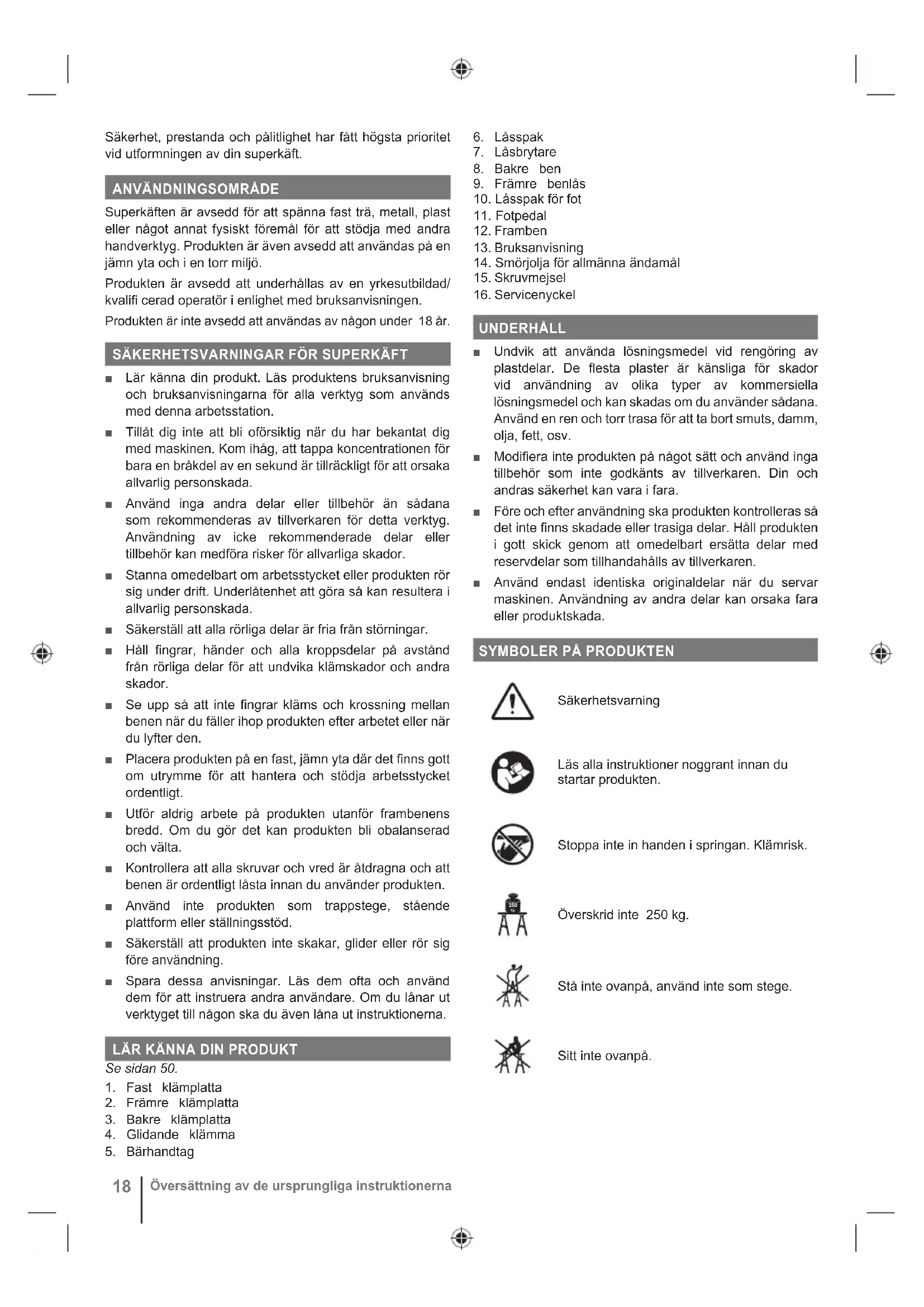 Superkäften är avsedd för att spänna fast trä, metall, plast eller något annat fysiskt föremål för att stödja med andra handverktyg. Produkten är även avsedd att användas på en jämn yta och i en torr miljö. Produkten är avsedd att underhållas av en yrkesutbildad/ kvalifi cerad operatör i enlighet med bruksanvisningen. Produkten är inte avsedd att användas av någon under 18 år.