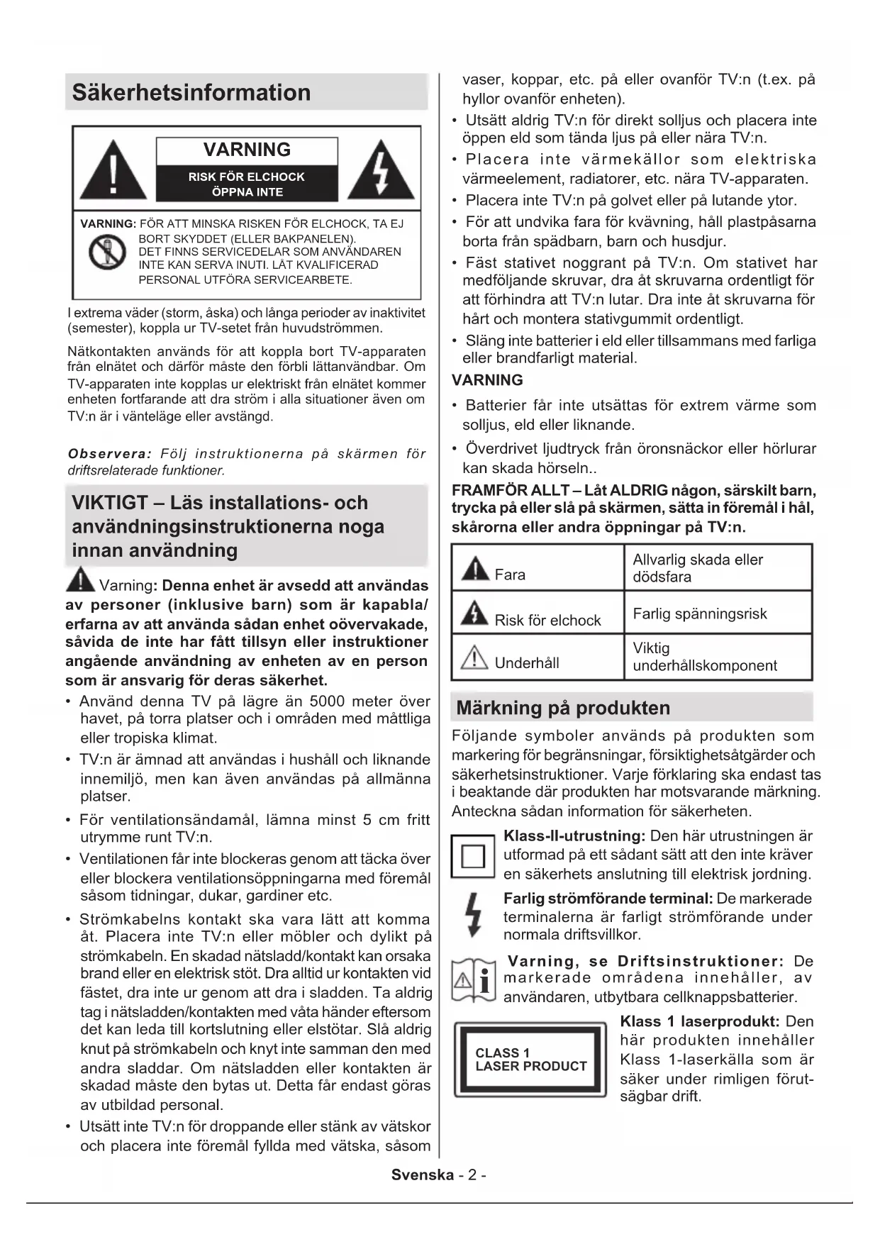 - Överdrivet ljudtryck från öronsnäckor eller hörlurar kan skada hörseln.. FRAMFÖR ALLT – Låt ALDRIG någon, särskilt barn, trycka på eller slå på skärmen, sätta in föremål i hål, skårorna eller andra öppningar på TV:n. FaraAllvarlig skada eller dödsfara Risk för elchockFarlig spänningsrisk UnderhållViktig underhållskomponent Märkning på produkten Följande symboler används på produkten som markering för begränsningar, försiktighetsåtgärder och