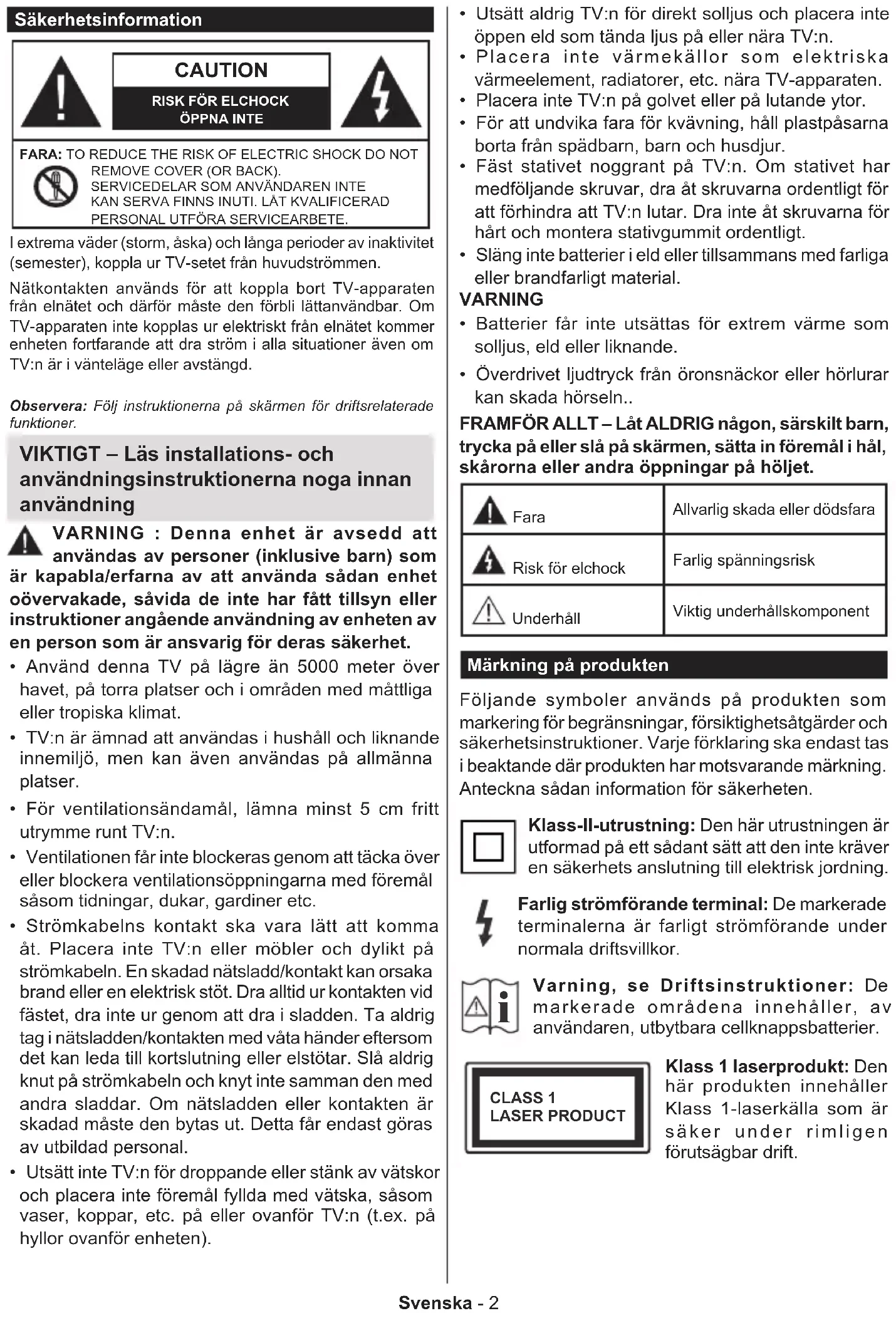 Varning, se Driftsinstruktioner: De markerade områdena innehåller, av användaren, utbytbara cellknappsbatterier. CLASS 1 LASER PRODUCT Klass 1 laserprodukt: Den här produkten innehåller Klass 1-laserkälla som är säker under rimligen förutsägbar drift.Svenska - 3 VARNING