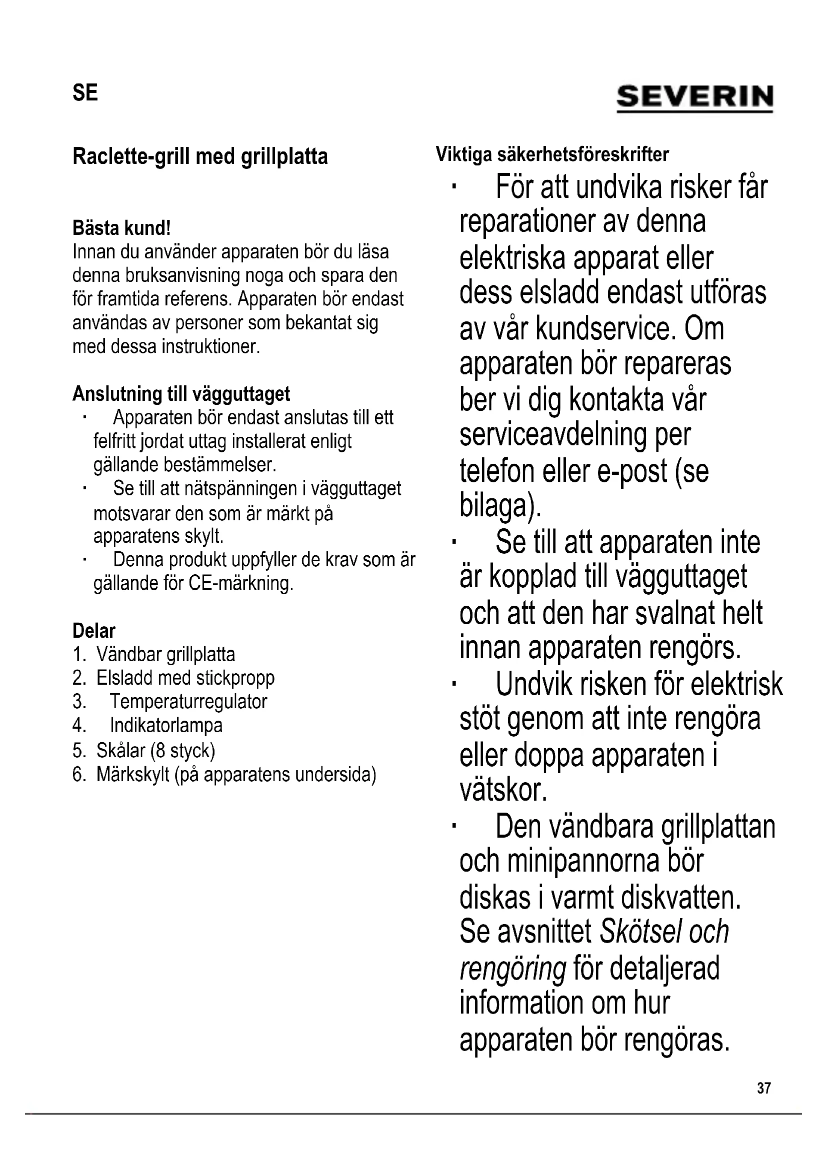 Raclette-grill med grillplatta Bästa kund! Innan du använder apparaten bör du läsa denna bruksanvisning noga och spara den för framtida referens. Apparaten bör endast användas av personer som bekantat sig med dessa instruktioner. Anslutning till vägguttaget ∙ Apparaten bör endast anslutas till ett felfritt jordat uttag installerat enligt gällande bestämmelser. ∙ Se till att nätspänningen i vägguttaget motsvarar den som är märkt på apparatens skylt. ∙ Denna produkt uppfyller de krav som är gällande för CE-märkning. Delar