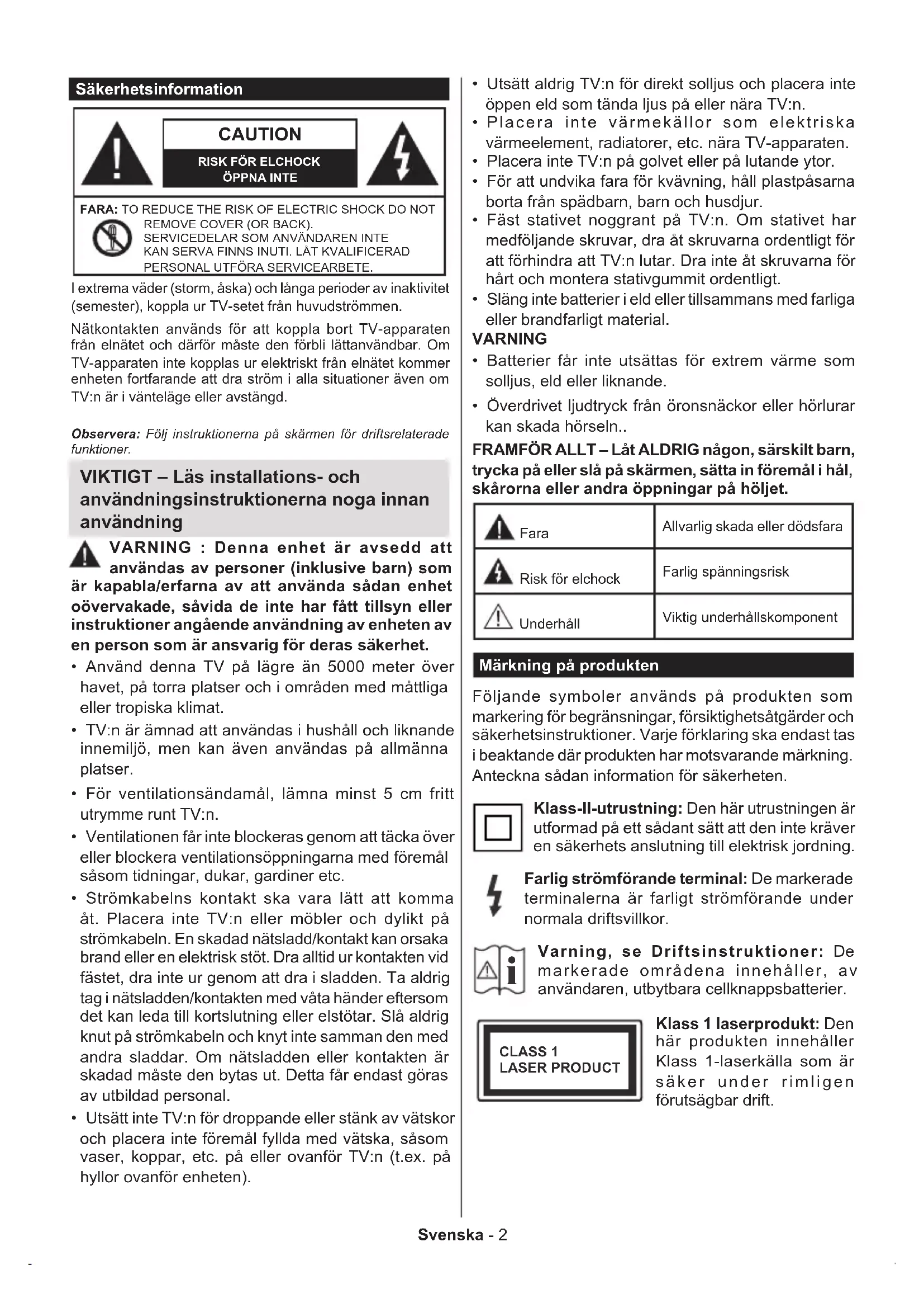 Varning, se Driftsinstruktioner: De markerade områdena innehåller, av användaren, utbytbara cellknappsbatterier. CLASS 1 LASER PRODUCT Klass 1 laserprodukt: Den här produkten innehåller Klass 1-laserkälla som är säker under rimligen förutsägbar drift.Svenska - 3 VARNING