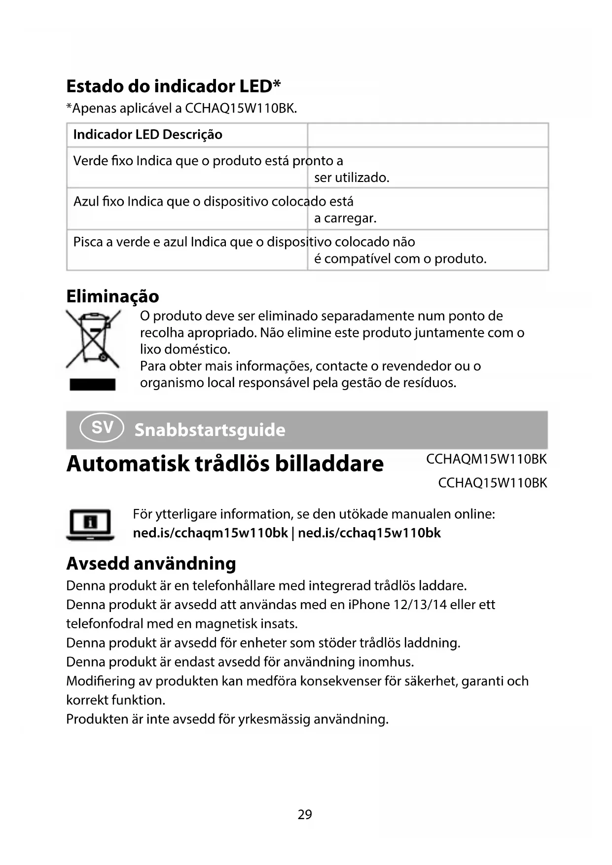 LED-lampans status* *Endast tillämpligt för CCHAQ15W110BK. LED-indikator Beskrivning Fast grönt sken Indikerar när produkten är klar för användning. Fast blått sken Indikerar att enheten som placerats laddar. Blinkar grönt och blått Indikerar att enheten som placerats inte är kompatibel med produkten. Bortskaning Produkten är avsedd för separat insamling vid en lämplig återvinningscentral. Släng inte denna produkt bland vanligt hushållsavfall. För mer information, kontakta återförsäljaren eller lokal myndighet med ansvar för avfallshantering.