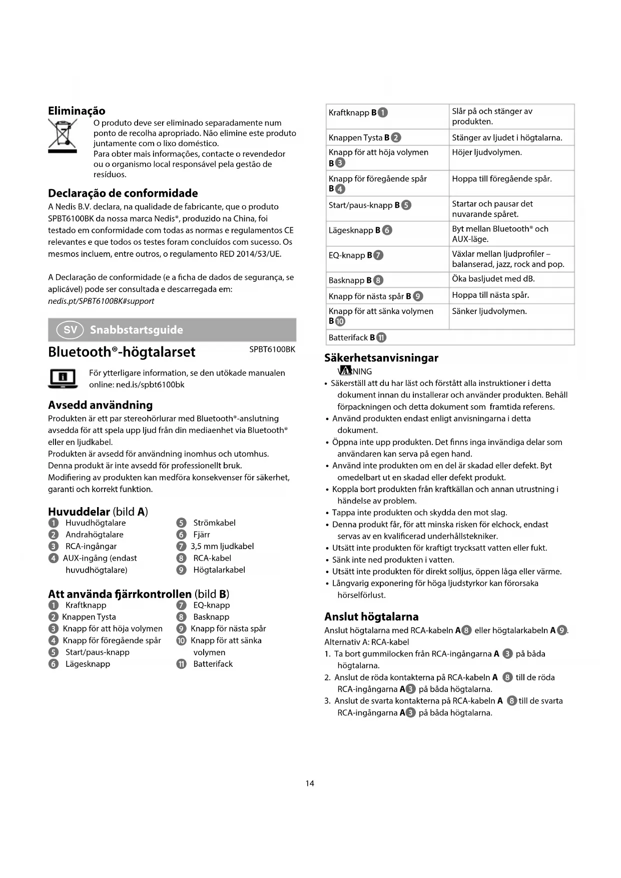 Snabbstartsguide Bluetooth®-högtalarset SPBT6100BKFör ytterligare information, se den utökade manualen online: ned.is/spbt6100bk Avsedd användning Produkten är ett par stereohörlurar med Bluetooth®-anslutning avsedda för att spela upp ljud från din mediaenhet via Bluetooth® eller en ljudkabel.Produkten är avsedd för användning inomhus och utomhus.Denna produkt är inte avsedd för professionellt bruk.Modiering av produkten kan medföra konsekvenser för säkerhet, garanti och korrekt funktion. Huvuddelar (bild A) 1 Huvudhögtalare 2 Andrahögtalare 3 RCA-ingångar 4 AUX-ingång (endast huvudhögtalare) 5 Strömkabel 6 Fjärr 7 3,5 mm ljudkabel 8 RCA-kabel 9 Högtalarkabel Att använda ärrkontrollen (bild B) 1 Kraftknapp 2 Knappen Tysta 3 Knapp för att höja volymen 4 Knapp för föregående spår 5 Start/paus-knapp 6 Lägesknapp 7 EQ-knapp 8 Basknapp 9 Knapp för nästa spår q Knapp för att sänka volymen w Batterifack15 Försäkran om överensstämmelse Vi, Nedis B.V., försäkrar som tillverkare att produkten SPBT6100BK från vårt varumärke Nedis®, tillverkad i Kina, har testats i enlighet med alla relevanta CE-standarder och föreskrifter och att alla tester genomförts med godkänt resultat. Detta inkluderar, men är inte begränsat till, radioutrustningsdirektivet 2014/53/EU.Den fullständiga försäkran om överensstämmelse (och säkerhetsdatabladet, om tillämpligt) kan läsas och laddas ned från:nedis.se/SPBT6100BK#support