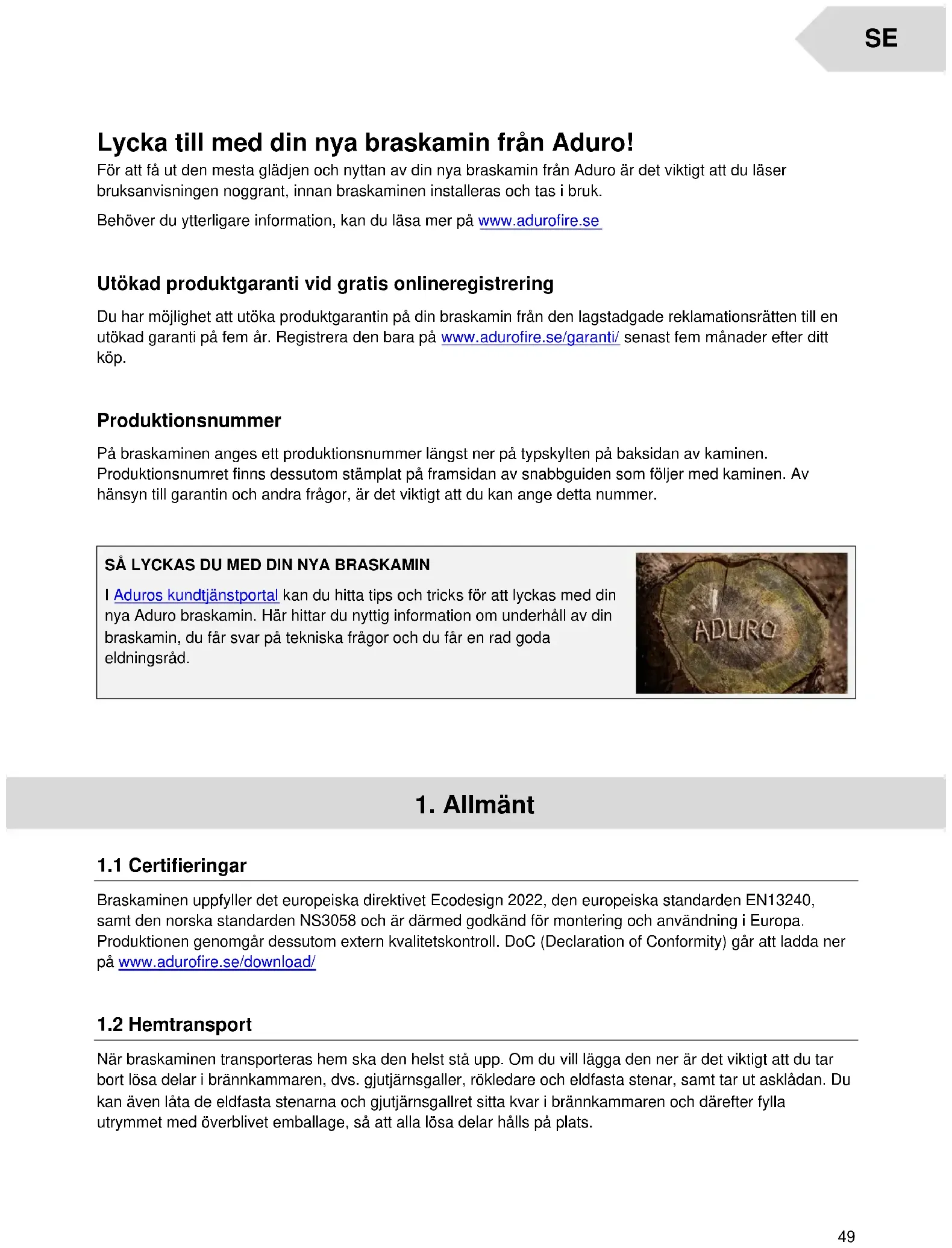 Lycka till med din nya braskamin från Aduro! För att få ut den mesta glädjen och nyttan av din nya braskamin från Aduro är det viktigt att du läser bruksanvisningen noggrant, innan braskaminen installeras och tas i bruk. Behöver du ytterligare information, kan du läsa mer på www.adurofire.se Utökad produktgaranti vid gratis onlineregistrering Du har möjlighet att utöka produktgarantin på din braskamin från den lagstadgade reklamationsrätten till en utökad garanti på fem år. Registrera den bara på www.adurofire.se/garanti/ senast fem månader efter ditt köp. Produktionsnummer På braskaminen anges ett produktionsnummer längst ner på typskylten på baksidan av kaminen. Produktionsnumret finns dessutom stämplat på framsidan av snabbguiden som följer med kaminen. Av hänsyn till garantin och andra frågor, är det viktigt att du kan ange detta nummer. SÅ LYCKAS DU MED DIN NYA BRASKAMIN I Aduros kundtjänstportal kan du hitta tips och tricks för att lyckas med din nya Aduro braskamin. Här hittar du nyttig information om underhåll av din braskamin, du får svar på tekniska frågor och du får en rad goda eldningsråd.