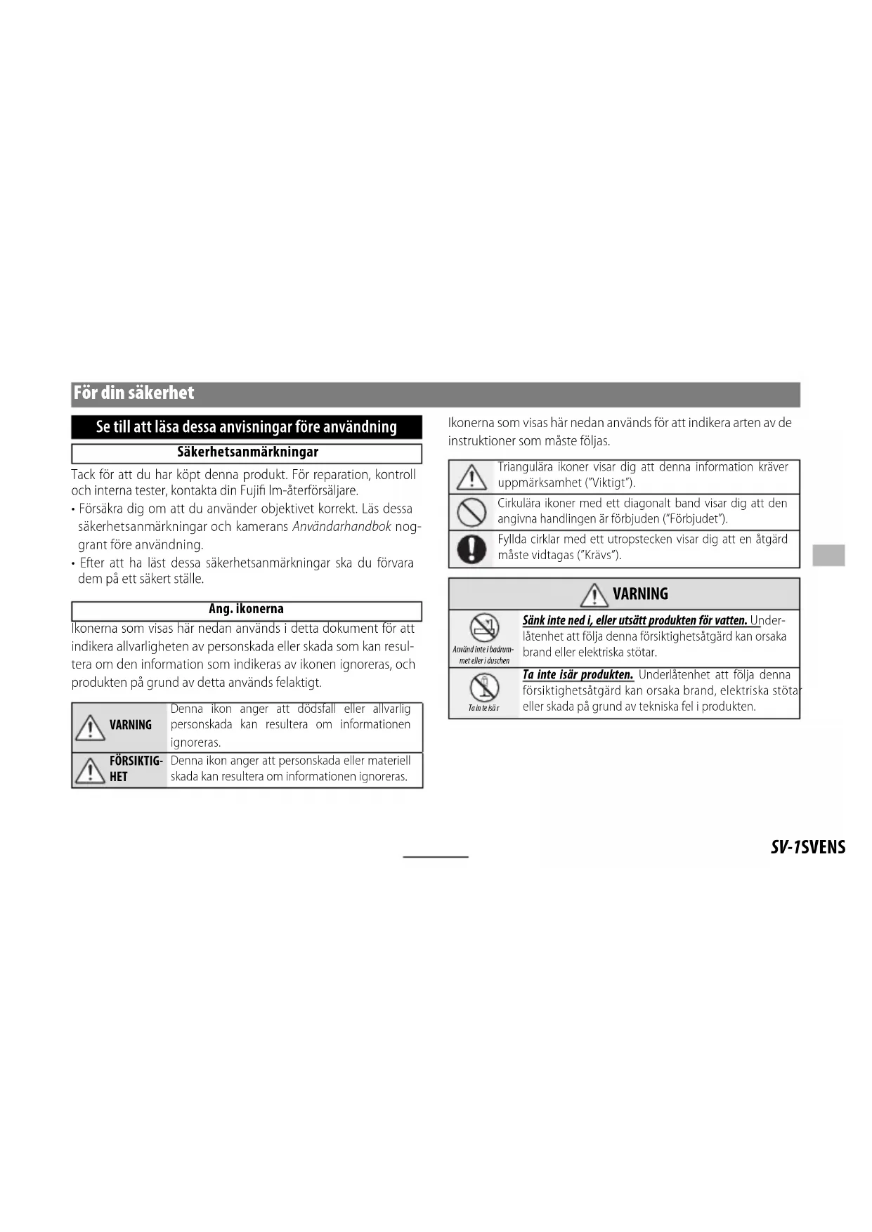- Efter att ha läst dessa säkerhetsanmärkningar ska du förvara dem på ett säkert ställe. Ang. ikonerna Ikonerna som visas här nedan används i detta dokument för att indikera allvarligheten av personskada eller skada som kan resul- tera om den information som indikeras av ikonen ignoreras, och produkten på grund av detta används felaktigt. VARNING Denna ikon anger att dödsfall eller allvarlig personskada kan resultera om informationen ignoreras. FÖRSIKTIG- HET Denna ikon anger att personskada eller materiell skada kan resultera om informationen ignoreras. Ikonerna som visas här nedan används för att indikera arten av de instruktioner som måste följas. Triangulära ikoner visar dig att denna information kräver uppmärksamhet (”Viktigt”). Cirkulära ikoner med ett diagonalt band visar dig att den angivna handlingen är förbjuden (”Förbjudet”). Fyllda cirklar med ett utropstecken visar dig att en åtgärd måste vidtagas (”Krävs”).