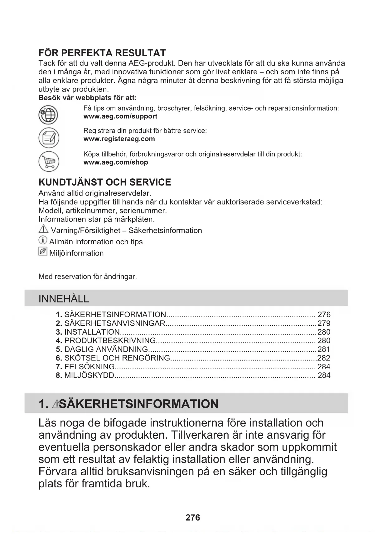 Tack för att du valt denna AEG-produkt. Den har utvecklats för att du ska kunna användaden i många år, med innovativa funktioner som gör livet enklare – och som inte finns påalla enklare produkter. Ägna några minuter åt denna beskrivning för att få största möjligautbyte av produkten.Besök vår webbplats för att:Få tips om användning, broschyrer, felsökning, service- och reparationsinformation:www.aeg.com/supportRegistrera din produkt för bättre service:www.registeraeg.comKöpa tillbehör, förbrukningsvaror och originalreservdelar till din produkt:www.aeg.com/shop