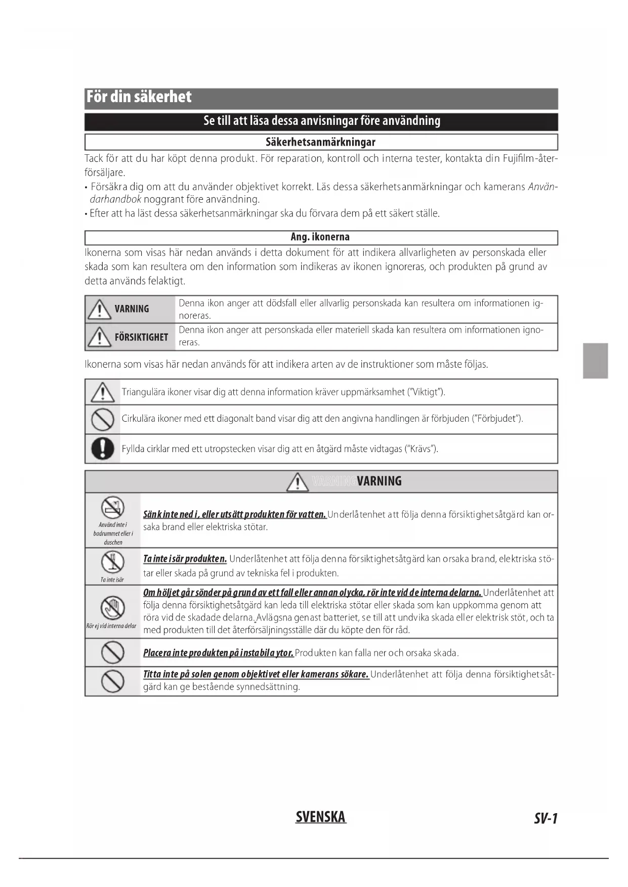 - Efter att ha läst dessa säkerhetsanmärkningar ska du förvara dem på ett säkert ställe. Ang. ikonerna Ikonerna som visas här nedan används i detta dokument för att indikera allvarligheten av personskada eller skada som kan resultera om den information som indikeras av ikonen ignoreras, och produkten på grund av detta används felaktigt. VARNINGDenna ikon anger att dödsfall eller allvarlig personskada kan resultera om informationen ig-noreras.FÖRSIKTIGHETDenna ikon anger att personskada eller materiell skada kan resultera om informationen igno-reras. Ikonerna som visas här nedan används för att indikera arten av de instruktioner som måste följas. Triangulära ikoner visar dig att denna information kräver uppmärksamhet (”Viktigt”).Cirkulära ikoner med ett diagonalt band visar dig att den angivna handlingen är förbjuden (”Förbjudet”).Fyllda cirklar med ett utropstecken visar dig att en åtgärd måste vidtagas (”Krävs”). VARNINGVARNING Använd inte i badrummet eller i duschen Sänk inte ned i, eller utsätt produkten för vatten. Underlåtenhet att följa denna försiktighetsåtgärd kan or- saka brand eller elektriska stötar.Ta inte isär Ta inte isär produkten. Underlåtenhet att följa denna försiktighetsåtgärd kan orsaka brand, elektriska stö- tar eller skada på grund av tekniska fel i produkten.Rör ej vid interna delar Om höljet går sönder på grund av ett fall eller annan olycka, rör inte vid de interna delarna. Underlåtenhet att följa denna försiktighetsåtgärd kan leda till elektriska stötar eller skada som kan uppkomma genom att röra vid de skadade delarna. Avlägsna genast batteriet, se till att undvika skada eller elektrisk stöt, och ta med produkten till det återförsäljningsställe där du köpte den för råd. Placera inte produkten på instabila ytor. Produkten kan falla ner och orsaka skada. Titta inte på solen genom objektivet eller kamerans sökare. Underlåtenhet att följa denna försiktighetsåt- gärd kan ge bestående synnedsättning.SV-2 SVENSKA