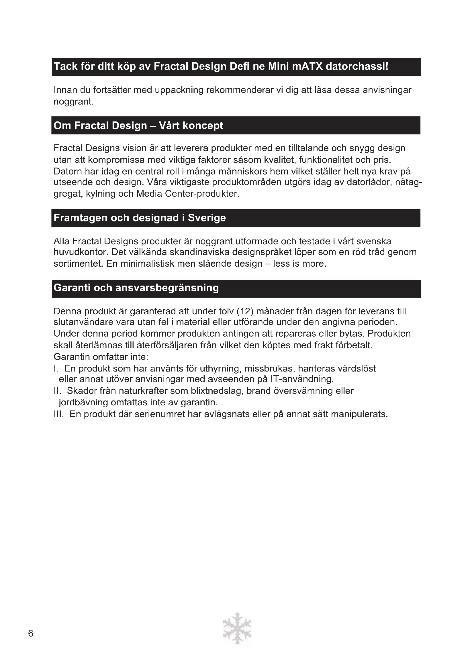 GB6 Tack för ditt köp av Fractal Design Defi ne Mini mATX datorchassi! Innan du fortsätter med uppackning rekommenderar vi dig att läsa dessa anvisningar noggrant. Om Fractal Design – Vårt koncept Fractal Designs vision är att leverera produkter med en tilltalande och snygg design utan att kompromissa med viktiga faktorer såsom kvalitet, funktionalitet och pris. Datorn har idag en central roll i många människors hem vilket ställer helt nya krav på utseende och design. Våra viktigaste produktområden utgörs idag av datorlådor, nätag- gregat, kylning och Media Center-produkter. Framtagen och designad i Sverige Alla Fractal Designs produkter är noggrant utformade och testade i vårt svenska huvudkontor. Det välkända skandinaviska designspråket löper som en röd tråd genom sortimentet. En minimalistisk men slående design – less is more. Garanti och ansvarsbegränsning Denna produkt är garanterad att under tolv (12) månader från dagen för leverans till slutanvändare vara utan fel i material eller utförande under den angivna perioden. Under denna period kommer produkten antingen att repareras eller bytas. Produkten skall återlämnas till återförsäljaren från vilket den köptes med frakt förbetalt. Garantin omfattar inte: