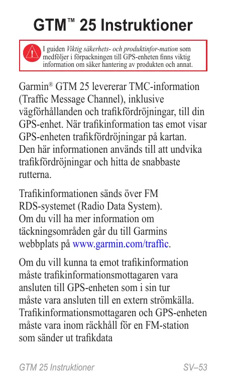 Garmin® GTM 25 levererar TMC-information (Traffic Message Channel), inklusive vägförhållanden och trafikfördröjningar, till din GPS-enhet. När trafikinformation tas emot visar GPS-enheten trafikfördröjningar på kartan. Den här informationen används till att undvika trafikfördröjningar och hitta de snabbaste rutterna. Trafikinformationen sänds över FM RDS-systemet (Radio Data System). Om du vill ha mer information om täckningsområden går du till Garmins webbplats på www.garmin.com/traffic. Om du vill kunna ta emot trafikinformation måste trafikinformationsmottagaren vara ansluten till GPS-enheten som i sin tur måste vara ansluten till en extern strömkälla. Trafikinformationsmottagaren och GPS-enheten måste vara inom räckhåll för en FM-station som sänder ut trafikdata GTM 25 Instruktioner