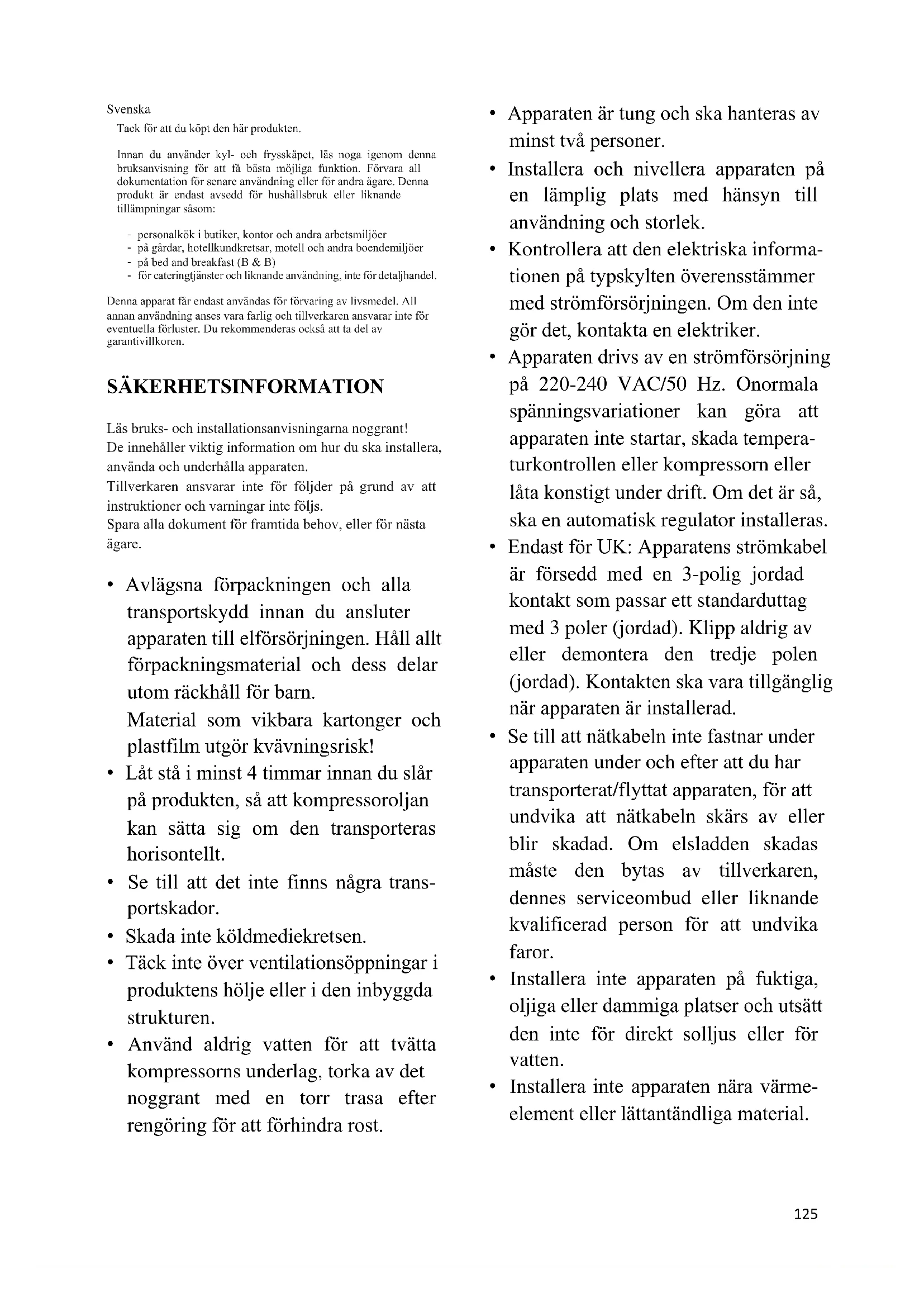 - Apparaten drivs av en strömförsörjning på 220-240 VAC/50 Hz. Onormala spänningsvariationer kan göra att apparaten inte startar, skada tempera- turkontrollen eller kompressorn eller låta konstigt under drift. Om det är så, ska en automatisk regulator installeras.