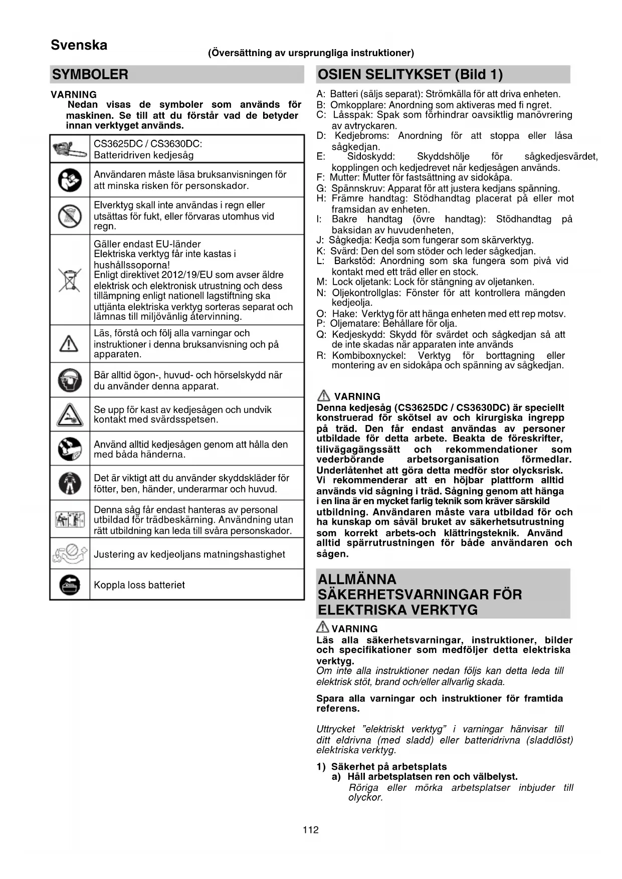 - está enferrujada Afi e a corrente da serra. Se o desgaste ou a quebra forem graves, substitua por uma corrente de serra nova. A direcção da corrente da serra está invertida. Volte a instalar certifi cando-se da direcção correcta. A tensão da corrente da serra está desapertada. Verifi que a tensão da corrente da serra e aperte se estiver desapertada. Óleo de corrente ○ com fl uxo lento ○ não sai (é interrompido) Falta de óleo de corrente no depósito. Reabasteça com óleo de corrente. O bico de óleo de corrente está obstruído. Limpe o bico de óleo de corrente. A bateria não pode ser instalada Tentar instalar uma bateria diferente da especifi cada para a ferramenta. Por favor, instale uma bateria tipo multitensão. 00BookCS3625DCEU.indb11100BookCS3625DCEU.indb111 2022/12/0816:29:322022/12/0816:29:32112 Svenska (Översättning av ursprungliga instruktioner) SYMBOLER VARNING Nedan visas de symboler som används för maskinen. Se till att du förstår vad de betyder innan verktyget används. CS3625DC / CS3630DC: Batteridriven kedjesåg Användaren måste läsa bruksanvisningen för att minska risken för personskador. Elverktyg skall inte användas i regn eller utsättas för fukt, eller förvaras utomhus vid regn. Gäller endast EU-länder Elektriska verktyg får inte kastas i hushållssoporna! Enligt direktivet 2012/19/EU som avser äldre elektrisk och elektronisk utrustning och dess tillämpning enligt nationell lagstiftning ska uttjänta elektriska verktyg sorteras separat och lämnas till miljövänlig återvinning. Läs, förstå och följ alla varningar och instruktioner i denna bruksanvisning och på apparaten. Bär alltid ögon-, huvud- och hörselskydd när du använder denna apparat. Se upp för kast av kedjesågen och undvik kontakt med svärdsspetsen. Använd alltid kedjesågen genom att hålla den med båda händerna. Det är viktigt att du använder skyddskläder för fötter, ben, händer, underarmar och huvud. Denna såg får endast hanteras av personal utbildad för trädbeskärning. Användning utan rätt utbildning kan leda till svåra personskador. Justering av kedjeoljans matningshastighet Koppla loss batteriet OSIEN SELITYKSET (Bild 1) A: Batteri (säljs separat): Strömkälla för att driva enheten. B: Omkopplare: Anordning som aktiveras med fi ngret. C: Låsspak: Spak som förhindrar oavsiktlig manövrering av avtryckaren. D: Kedjebroms: Anordning för att stoppa eller låsa sågkedjan. E: Sidoskydd: Skyddshölje för sågkedjesvärdet, kopplingen och kedjedrevet när kedjesågen används. F: Mutter: Mutter för fastsättning av sidokåpa. G: Spännskruv: Apparat för att justera kedjans spänning. H: Främre handtag: Stödhandtag placerat på eller mot framsidan av enheten. I: Bakre handtag (övre handtag): Stödhandtag på baksidan av huvudenheten, J: Sågkedja: Kedja som fungerar som skärverktyg. K: Svärd: Den del som stöder och leder sågkedjan. L: Barkstöd: Anordning som ska fungera som pivå vid kontakt med ett träd eller en stock. M: Lock oljetank: Lock för stängning av oljetanken. N: Oljekontrollglas: Fönster för att kontrollera mängden kedjeolja. O: Hake: Verktyg för att hänga enheten med ett rep motsv. P: Oljematare: Behållare för olja. Q: Kedjeskydd: Skydd för svärdet och sågkedjan så att de inte skadas när apparaten inte används R: Kombiboxnyckel: Verktyg för borttagning eller montering av en sidokåpa och spänning av sågkedjan. VARNING Denna kedjesåg (CS3625DC / CS3630DC) är speciellt konstruerad för skötsel av och kirurgiska ingrepp på träd. Den får endast användas av personer utbildade för detta arbete. Beakta de föreskrifter, tilivägagängssätt och rekommendationer som vederbörande arbetsorganisation förmedlar. Underlåtenhet att göra detta medför stor olycksrisk. Vi rekommenderar att en höjbar plattform alltid används vid sågning i träd. Sågning genom att hänga i en lina är en mycket farlig teknik som kräver särskild utbildning. Användaren måste vara utbildad för och ha kunskap om såväl bruket av säkerhetsutrustning som korrekt arbets-och klättringsteknik. Använd alltid spärrutrustningen för både användaren och sågen. ALLMÄNNA