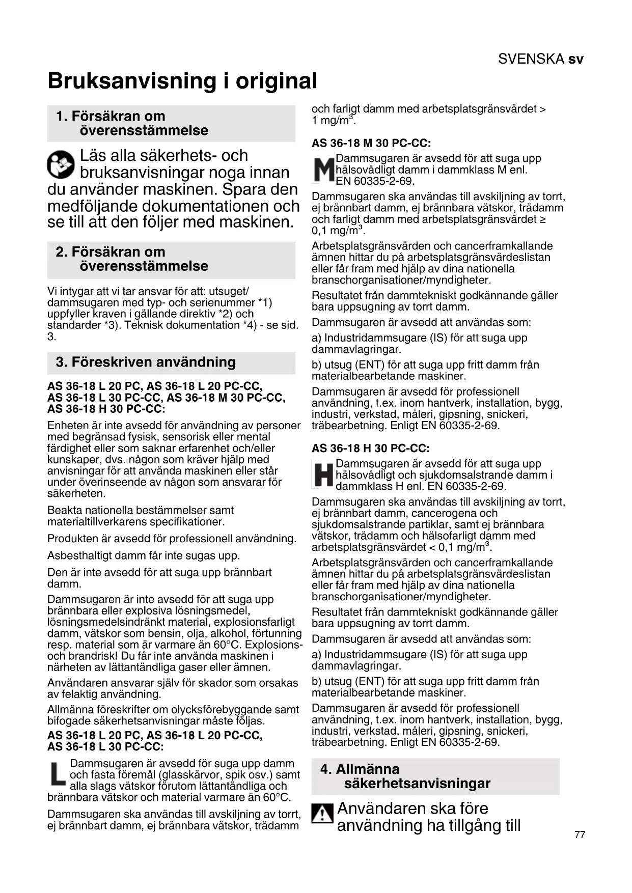 AS 36-18 L 20 PC, AS 36-18 L 20 PC-CC, AS 36-18 L 30 PC-CC, AS 36-18 M 30 PC-CC, AS 36-18 H 30 PC-CC: Enheten är inte avsedd för användning av personer med begränsad fysisk, sensorisk eller mental färdighet eller som saknar erfarenhet och/eller kunskaper, dvs. någon som kräver hjälp med anvisningar för att använda maskinen eller står under överinseende av någon som ansvarar för säkerheten. Beakta nationella bestämmelser samt materialtillverkarens specifikationer. Produkten är avsedd för professionell användning. Asbesthaltigt damm får inte sugas upp. Den är inte avsedd för att suga upp brännbart damm. Dammsugaren är inte avsedd för att suga upp brännbara eller explosiva lösningsmedel, lösningsmedelsindränkt material, explosionsfarligt damm, vätskor som bensin, olja, alkohol, förtunning resp. material som är varmare än 60°C. Explosions- och brandrisk! Du får inte använda maskinen i närheten av lättantändliga gaser eller ämnen. Användaren ansvarar själv för skador som orsakas av felaktig användning. Allmänna föreskrifter om olycksförebyggande samt bifogade säkerhetsanvisningar måste följas. AS 36-18 L 20 PC, AS 36-18 L 20 PC-CC, AS 36-18 L 30 PC-CC: Dammsugaren är avsedd för suga upp damm och fasta föremål (glasskärvor, spik osv.) samt alla slags vätskor förutom lättantändliga och brännbara vätskor och material varmare än 60°C. Dammsugaren ska användas till avskiljning av torrt, ej brännbart damm, ej brännbara vätskor, trädamm och farligt damm med arbetsplatsgränsvärdet > 1 mg/m³. AS 36-18 M 30 PC-CC: Dammsugaren är avsedd för att suga upp hälsovådligt damm i dammklass M enl. EN 60335-2-69. Dammsugaren ska användas till avskiljning av torrt, ej brännbart damm, ej brännbara vätskor, trädamm och farligt damm med arbetsplatsgränsvärdet ≥ 0,1 mg/m³. Arbetsplatsgränsvärden och cancerframkallande ämnen hittar du på arbetsplatsgränsvärdeslistan eller får fram med hjälp av dina nationella branschorganisationer/myndigheter. Resultatet från dammtekniskt godkännande gäller bara uppsugning av torrt damm. Dammsugaren är avsedd att användas som: a) Industridammsugare (IS) för att suga upp dammavlagringar. b) utsug (ENT) för att suga upp fritt damm från materialbearbetande maskiner. Dammsugaren är avsedd för professionell användning, t.ex. inom hantverk, installation, bygg, industri, verkstad, måleri, gipsning, snickeri, träbearbetning. Enligt EN 60335-2-69. AS 36-18 H 30 PC-CC: Dammsugaren är avsedd för att suga upp hälsovådligt och sjukdomsalstrande damm i dammklass H enl. EN 60335-2-69. Dammsugaren ska användas till avskiljning av torrt, ej brännbart damm, cancerogena och sjukdomsalstrande partiklar, samt ej brännbara vätskor, trädamm och hälsofarligt damm med arbetsplatsgränsvärdet < 0,1 mg/m³. Arbetsplatsgränsvärden och cancerframkallande ämnen hittar du på arbetsplatsgränsvärdeslistan eller får fram med hjälp av dina nationella branschorganisationer/myndigheter. Resultatet från dammtekniskt godkännande gäller bara uppsugning av torrt damm. Dammsugaren är avsedd att användas som: a) Industridammsugare (IS) för att suga upp dammavlagringar. b) utsug (ENT) för att suga upp fritt damm från materialbearbetande maskiner. Dammsugaren är avsedd för professionell användning, t.ex. inom hantverk, installation, bygg, industri, verkstad, måleri, gipsning, snickeri, träbearbetning. Enligt EN 60335-2-69. Användaren ska före användning ha tillgång till